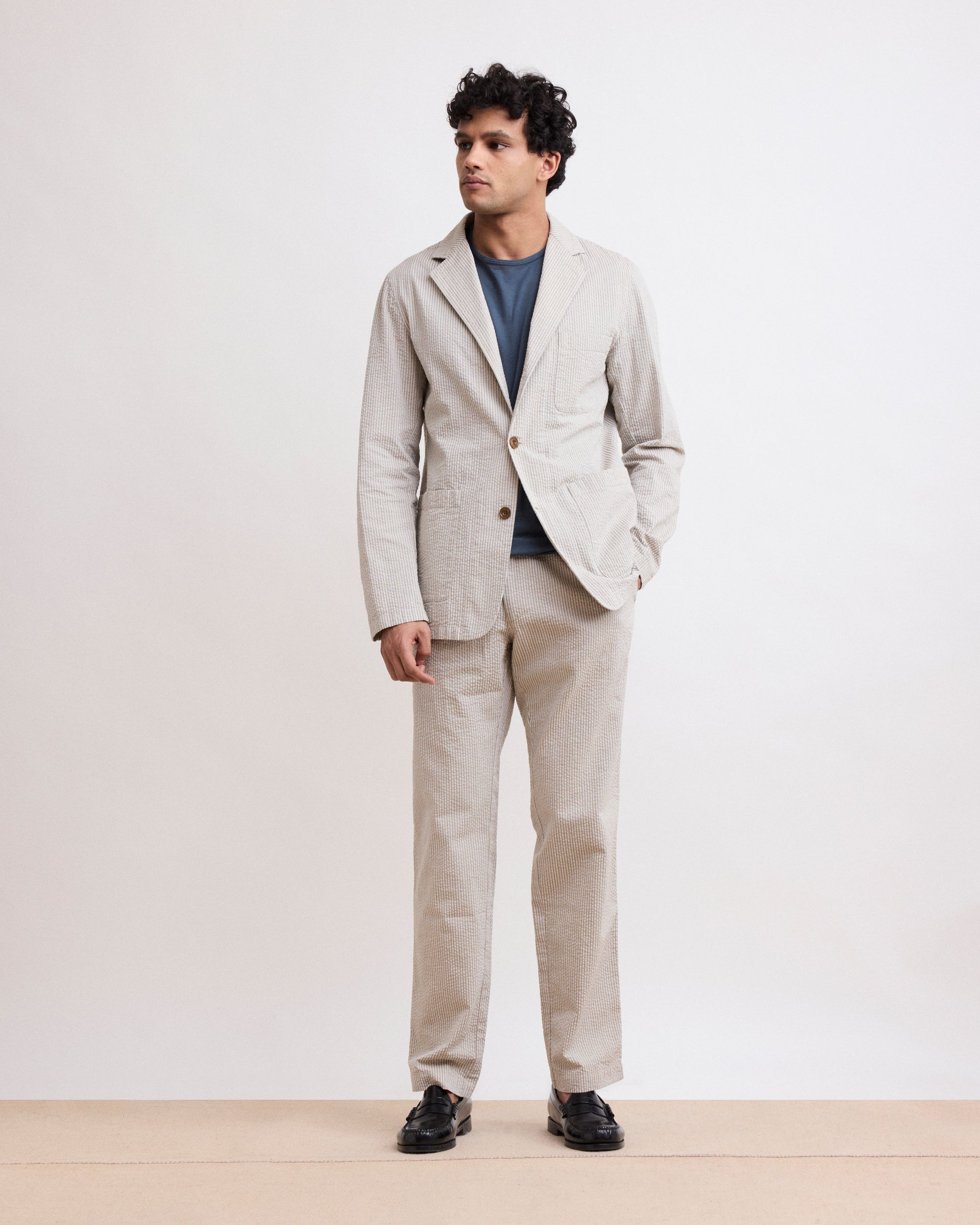 Essential in the summer season, the suit men In Seersucker seduced by its resolutely casual look. Its embossed and textured fabric gives it both structure and fluidity, offering an ideal alternative for the wardrobe of themen Hartford. Designed to combine lightness and elegance, the Fresco cotton ensures impeccable outfit while letting the silhouette breathe. Appreciated in light blue, beige or stripes - an effect obtained thanks to a controlled weaving in the heart of our workshops -, it goes easily with sober pieces. For a classic approach, the costume men goes perfectly with our selection of shirts men. Those looking for a more relaxed style can associate it with a t-shirt or a polo shirt. Worn in total look with its matching or mismatched pants with a more casual bottom, the Seersucker costume adapts to all desires with natural elegance.
