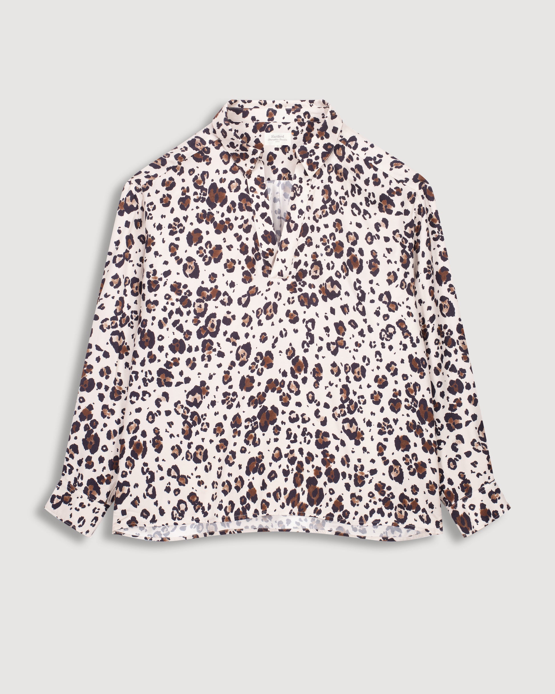 Loose-fitting women's blouse in exclusive leopard-print viscose satin with polo collar and V-neck opening. Dropped armholes and liquette hem.