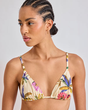 Women's triangle bikini top on adjustable tie with adjustable straps that can be worn straight or tied at the neck. Exclusive "Leaves and Flowers" print.