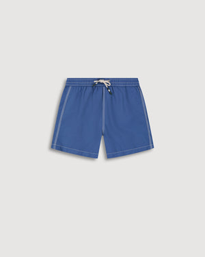 Boy's Swim Trunks with elastic waistband, drawcord and flap pocket on back, mid-length fit.