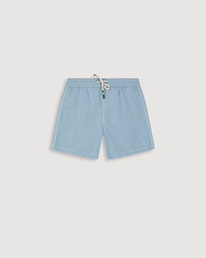 Boy's Swim Trunks with elastic waistband, drawcord and flap pocket on back, mid-length fit.
