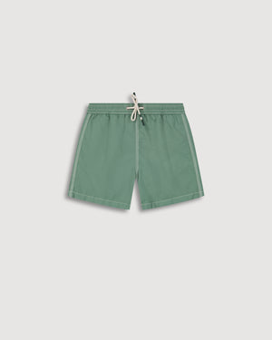 Boy's Swim Trunks with elastic waistband, drawcord and flap pocket on back, mid-length fit.