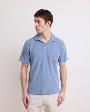 Men's terry cloth polo with short sleeves, chest pocket and open collar.