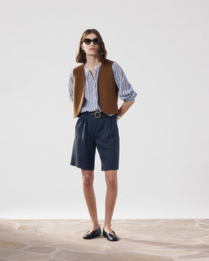 Women's Bermuda shorts with darts. Flat Belt at front and elasticated at back with loop. Zipper closure with button at waist. Italian side pockets and buttoned welt pockets on back.