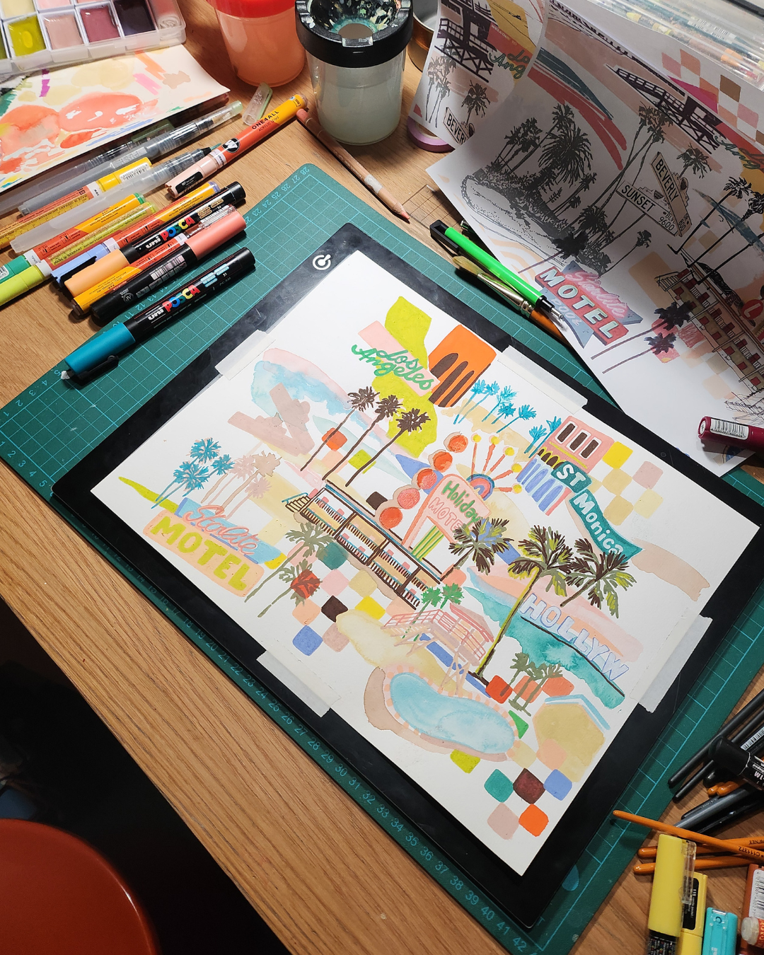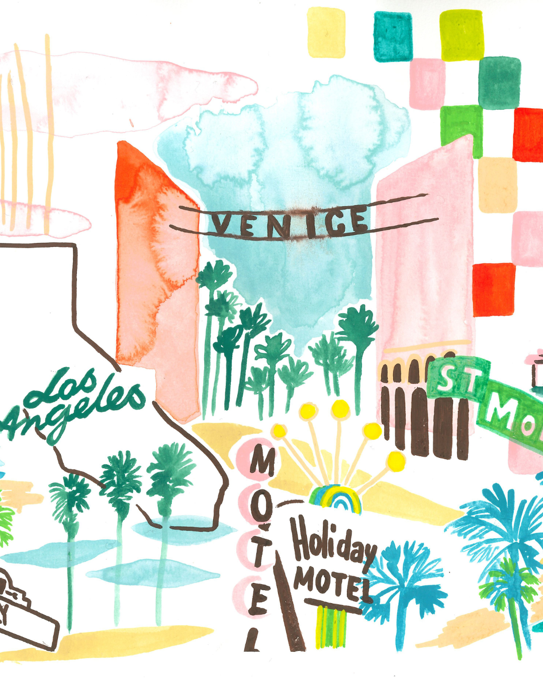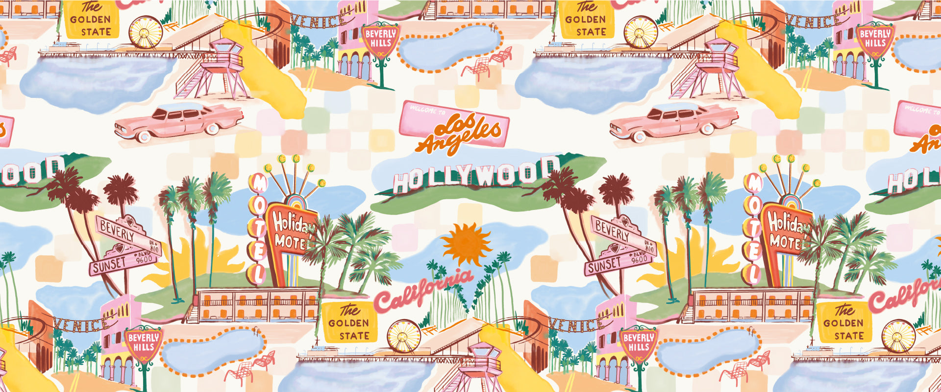 It's a mix of graphic elements that symbolize Los Angeles and Hollywood! I represented some emblematic elements: The Hollywood Sign, the entrance to Venice, a Motel, Palm trees, the Beverly Hills sign...
