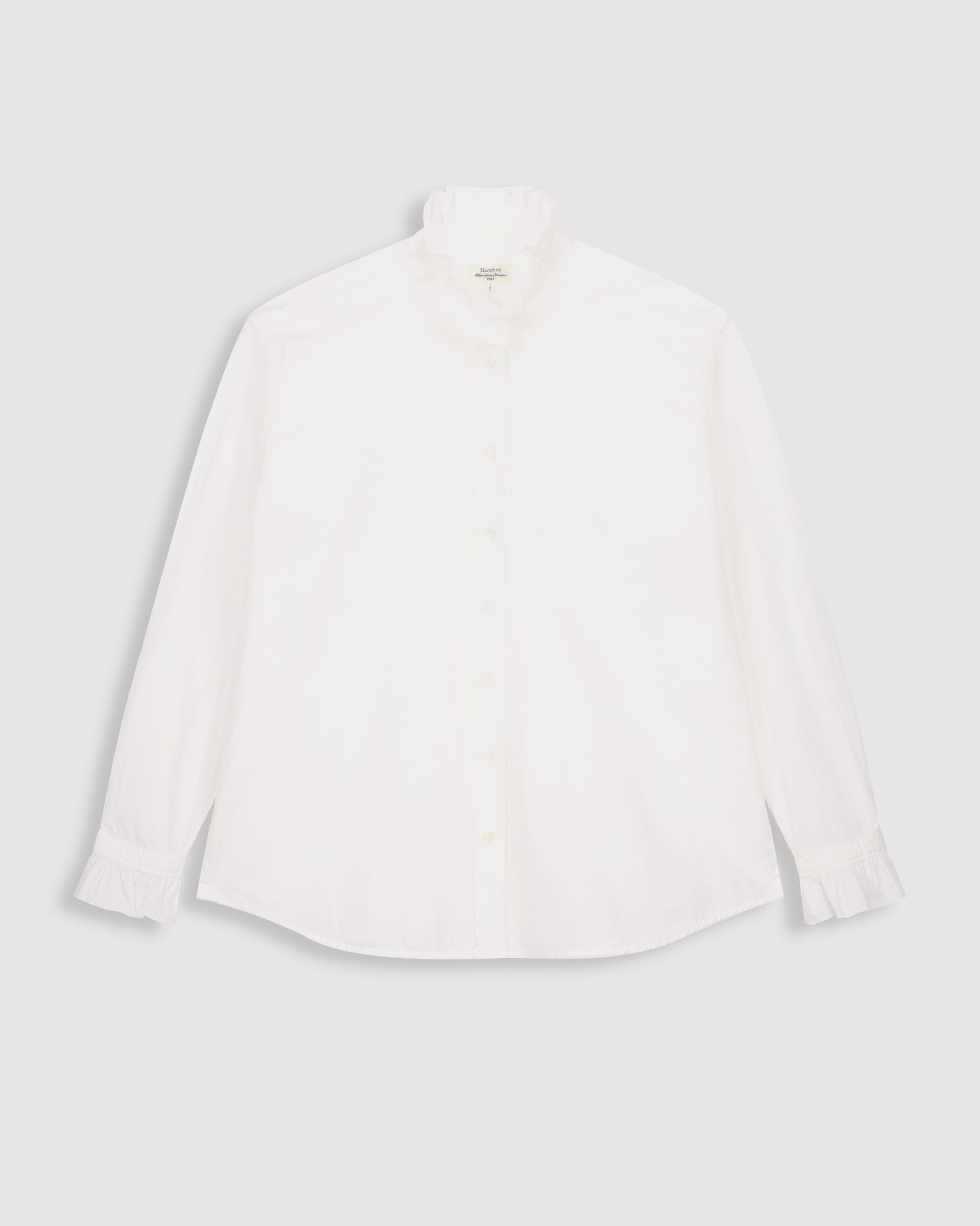 Loose-fitting women's shirt in cotton poplin with ruffled stand-up collar. Exposed button placket with mother-of-pearl buttons. Slightly dropped armholes and tightened ruffled cuffs. Lateral slits and liquette hem.