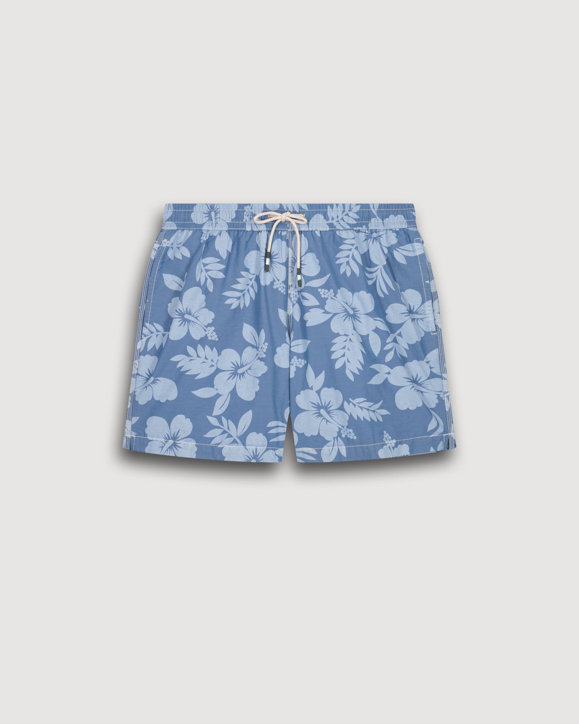 Men's Denim Blue Hibiscus Printed Swim Trunks