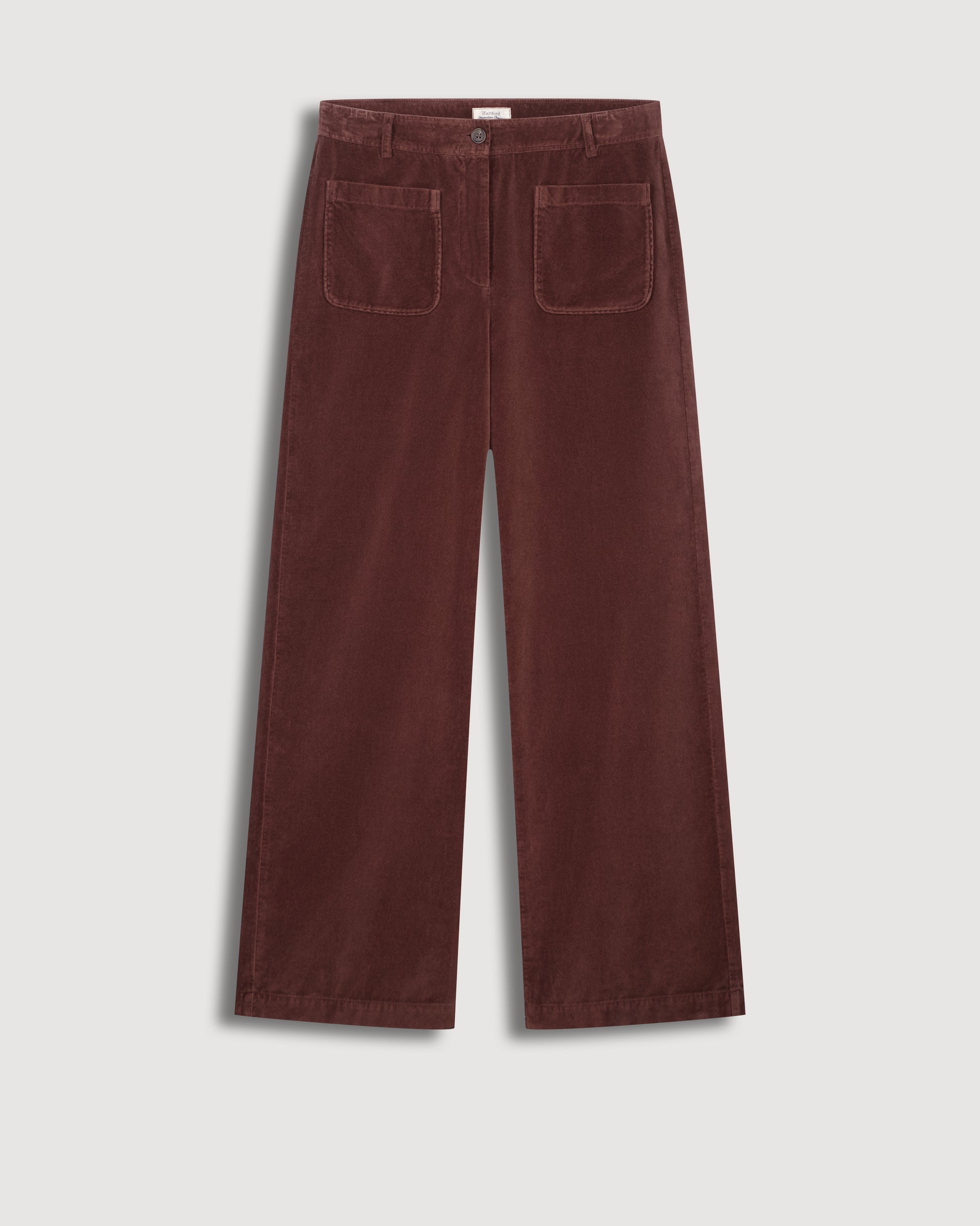 Women's straight-leg pants, fitted at the hips and 7/8ths length. Flat waistband with belt loops. Zipper and button closure at waist. Two patch pockets on front and buttoned welt pockets on back.