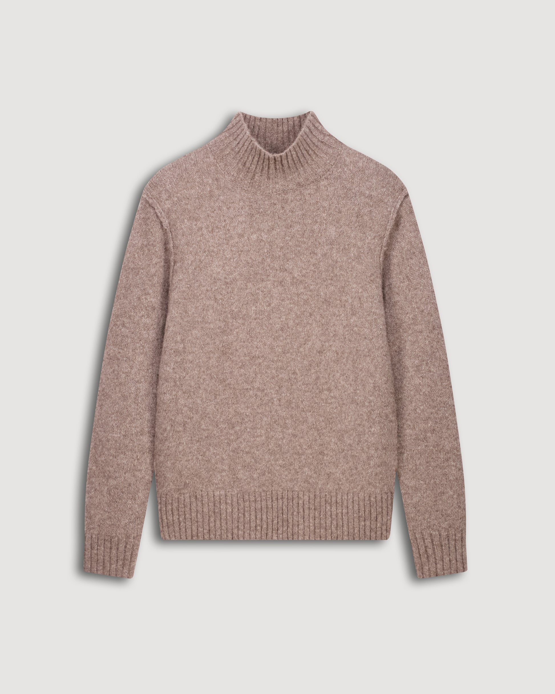 High-neck sweater with ribbed cuffs, collar and waistband. Exposed seam details.