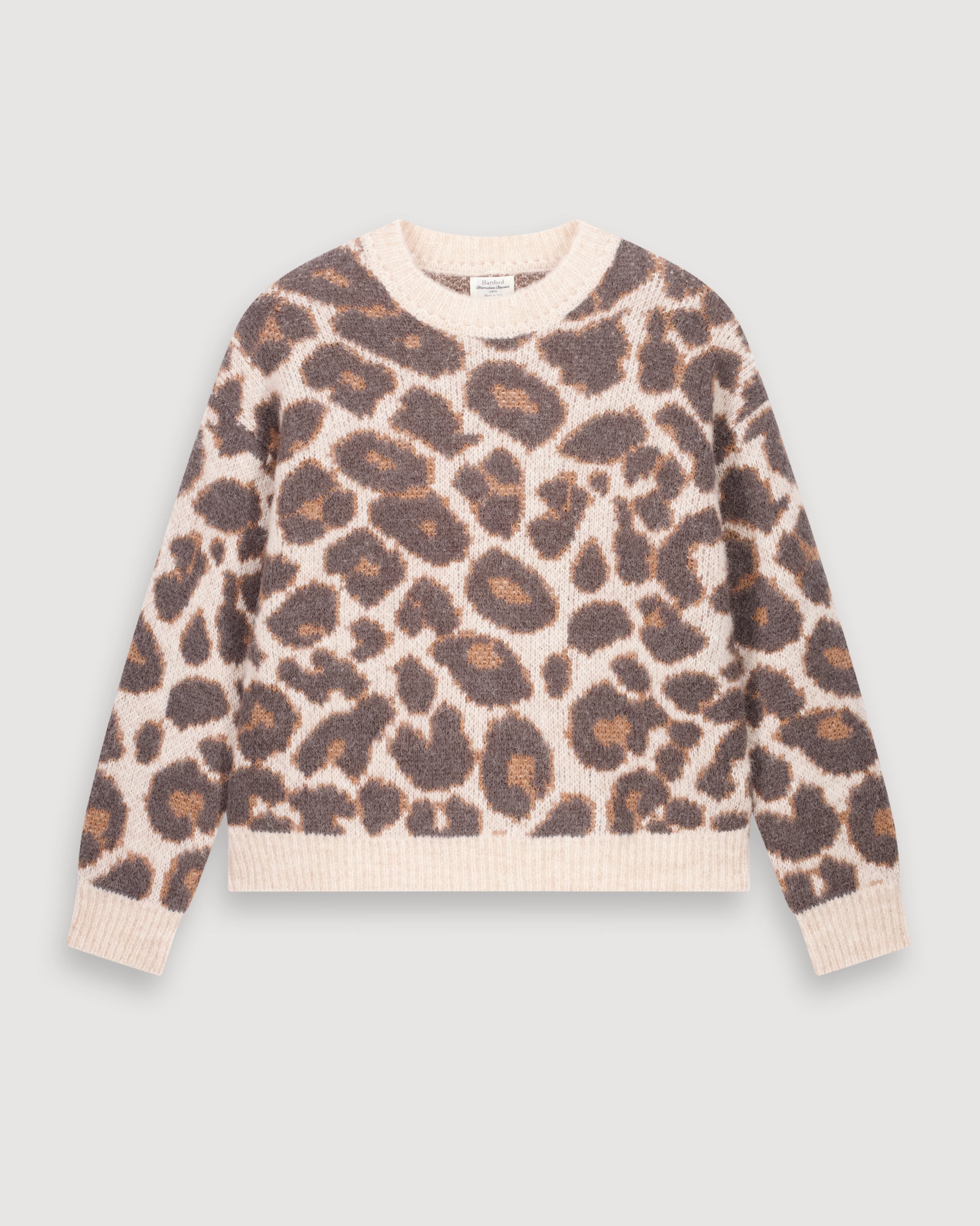Leopard jacquard women's sweater with round neck and dropped armholes. Contrasting rib trim.