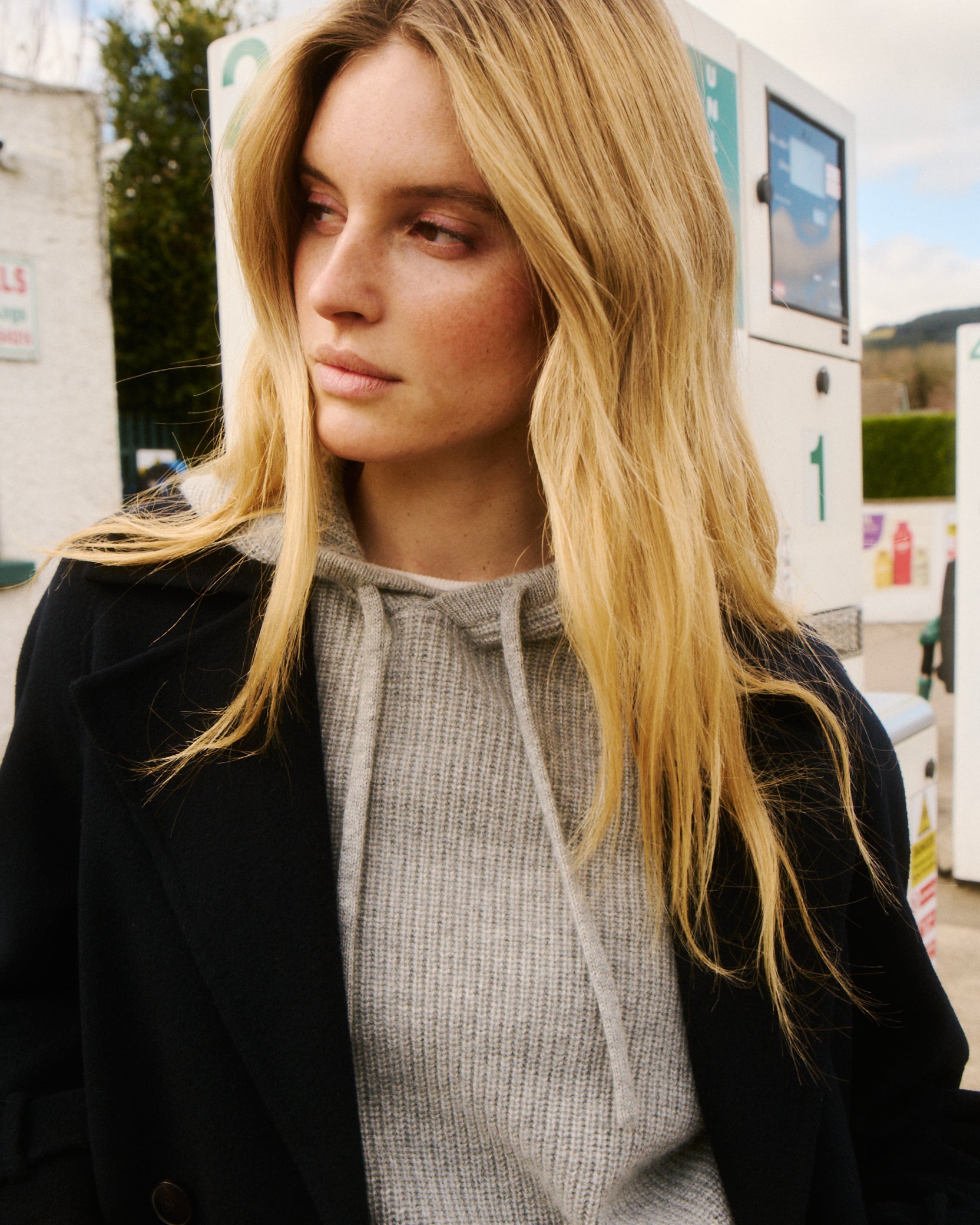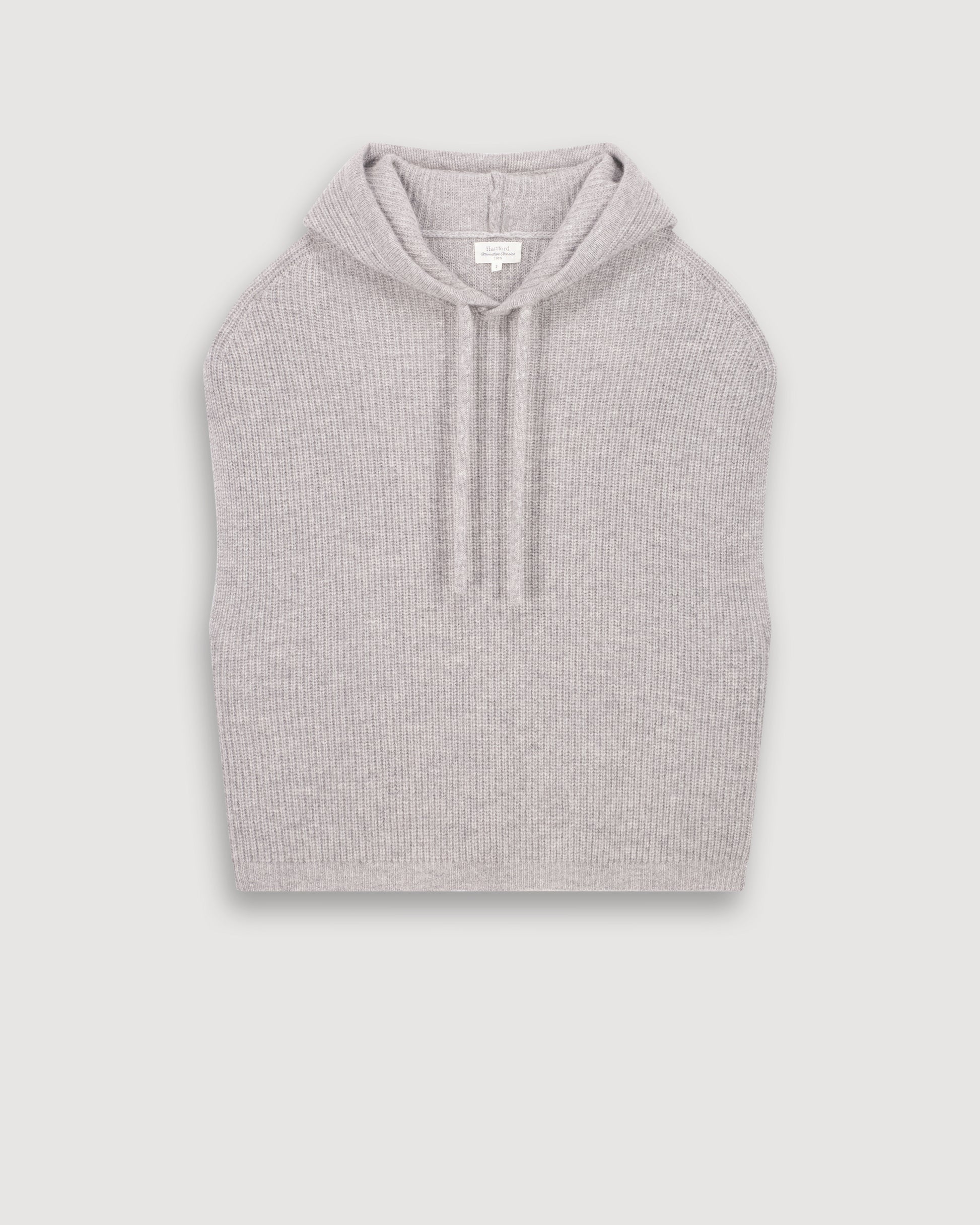 Sleeveless women's rib-knit sweater with hood. Drop armholes. Ribbing on shoulders.