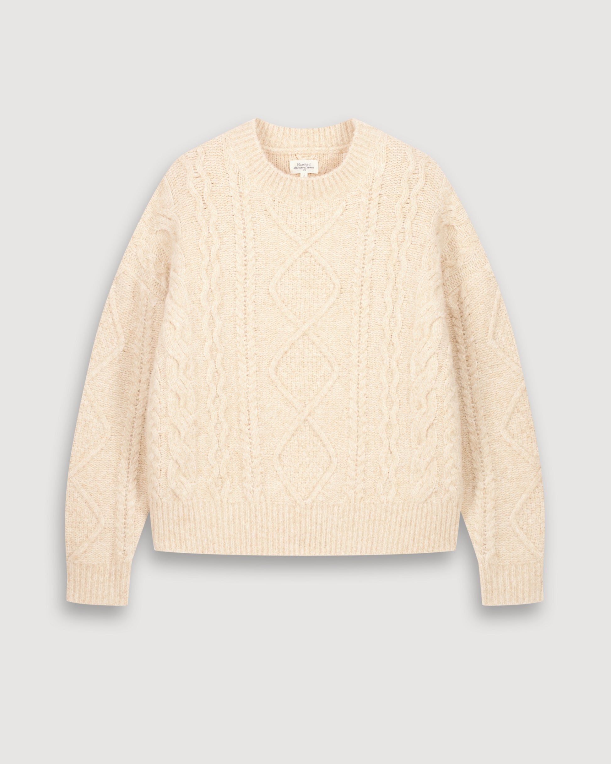 Loose-fitting women's round-neck sweater. Dropped armholes. Ribbed trim.