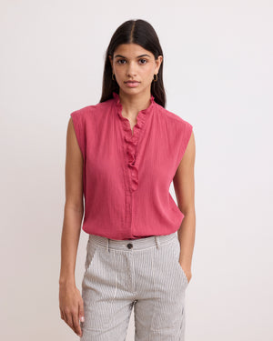 Sleeveless women's shirt in cotton crepe. Ruffled collar with ruffle detail at shoulders. Invisible button placket with mother-of-pearl buttons.