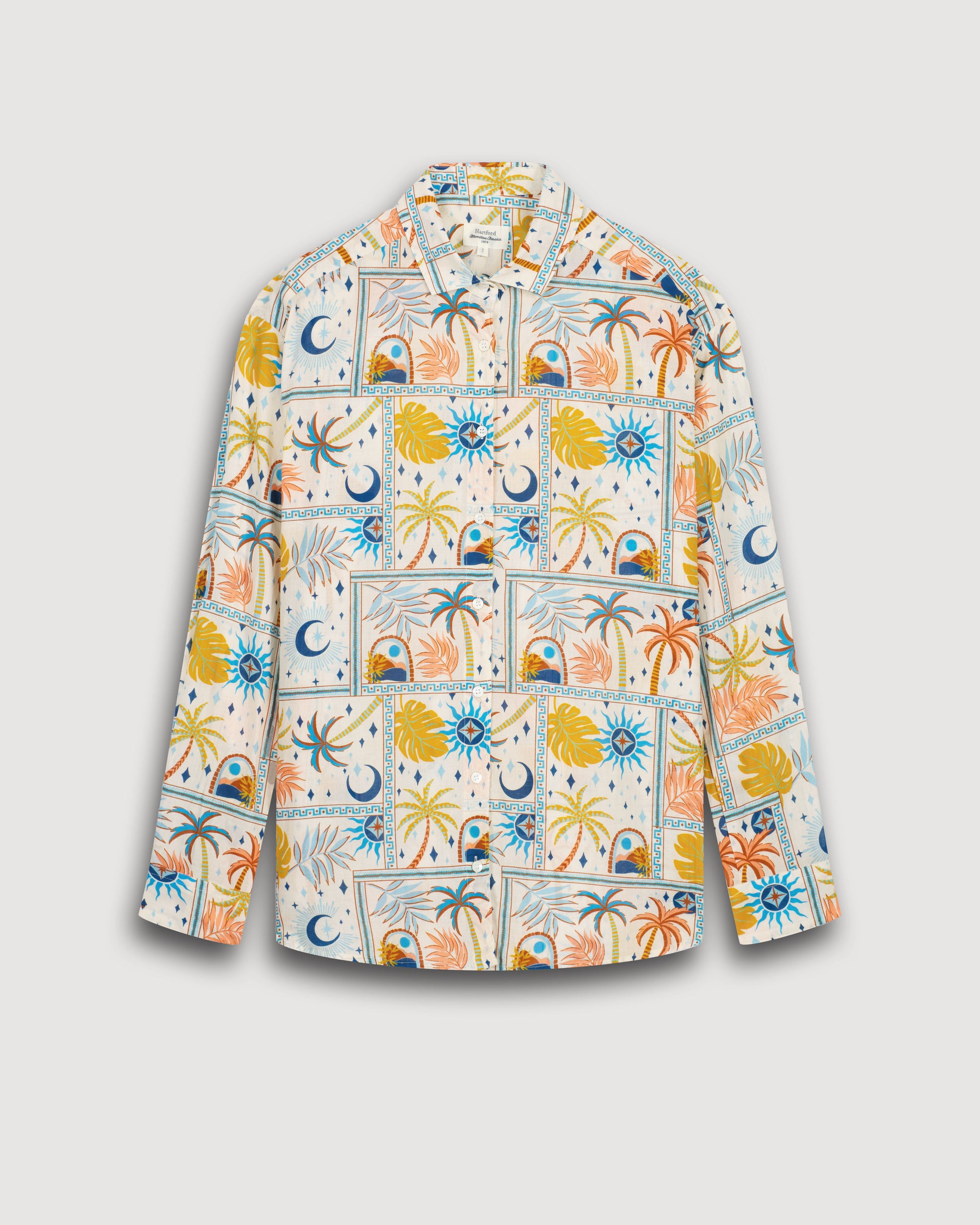 Women's loose-fitting shirt in exclusive Astro-printed Cotton Voile. Dropped armhole and exposed button placket with mother-of-pearl buttons.