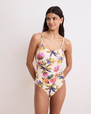 Women's one-piece Swim Trunks with exclusive "Leaves and Flowers" print. U-shaped neckline and thin, adjustable straps.