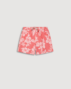 Boy's Swim Trunks with elastic waistband, drawcord and flap pocket on back, mid-length fit.