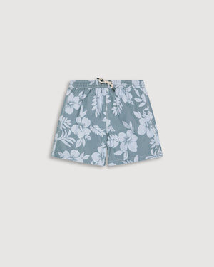Boy's Swim Trunks with elastic waistband, drawcord and flap pocket on back, mid-length fit.
