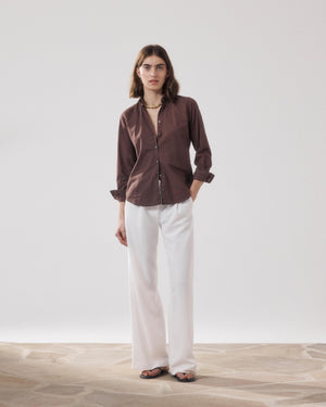 Women's long pants with darts. Wide legs. High waistband. Two side pockets. Belt loops. Button zipper. Back buttoned welt pockets.