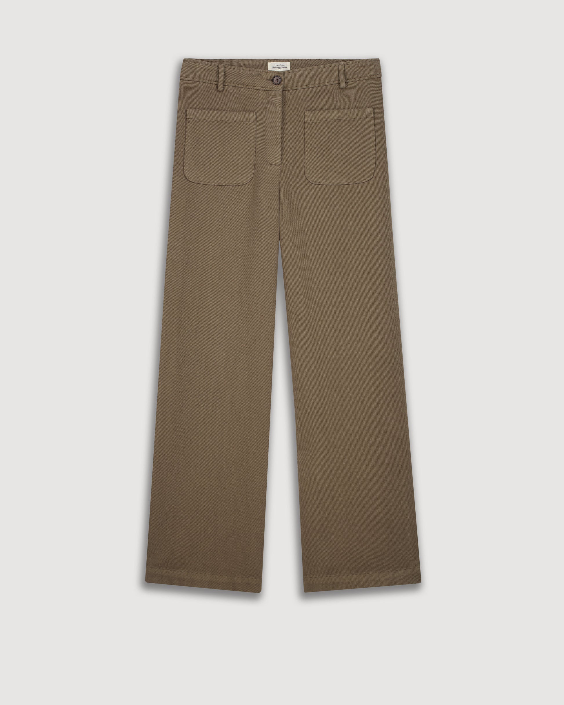 Women's straight-cut pants with high waist and 7/8th length. Waistband with belt loops. Zipper and button closure at waist. Patch pockets on front and buttoned welt pockets on back. Top-stitched hem.