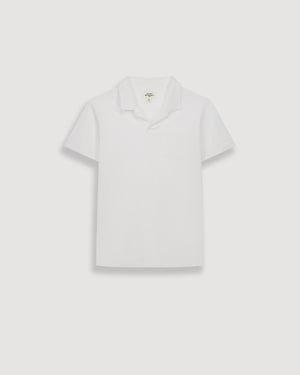 Boy's short-sleeved polo shirt with buttonless collar and chest pocket.