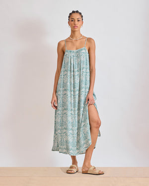 Women's long dress with thin, adjustable straps in exclusive palm-print viscose crepe. Two side pockets and two side slits.