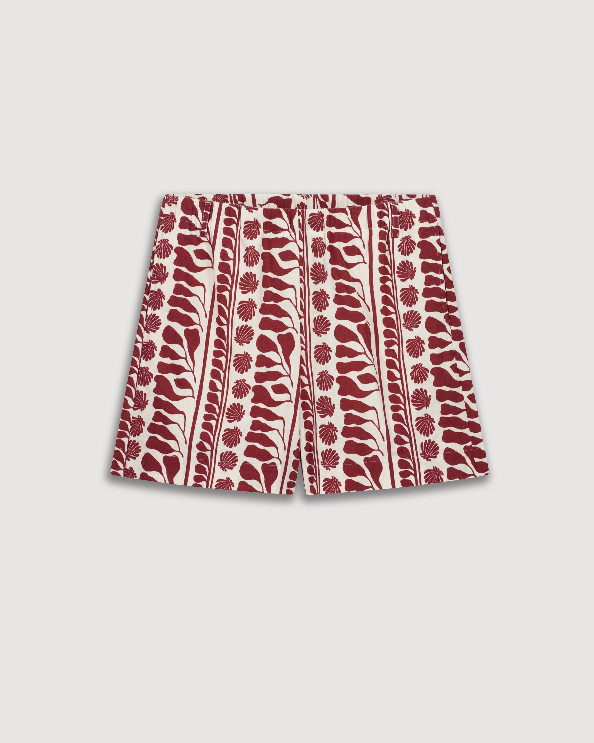 Women's shorts with elastic waistband and belt loops in linen & cotton with exclusive shell print. Two front bias pockets and two back buttoned patch pockets.