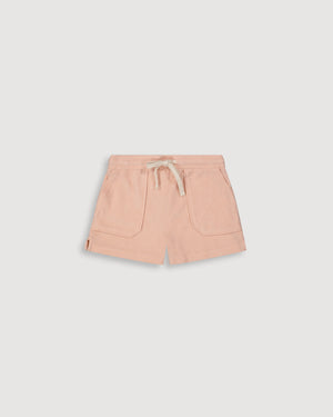 Girl's short terrycloth shorts. Elastic waistband with ecru drawstring. Two front patch pockets and one back patch pocket.
