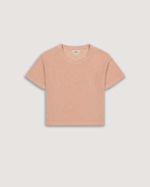Girls' T-shirt, loose-fitting pair, short-sleeved round neck in terry cotton. Drop armholes.