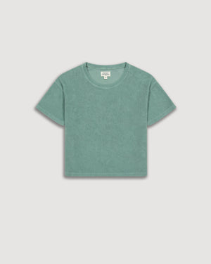 Girls' T-shirt, loose-fitting pair, short-sleeved round neck in terry cotton. Drop armholes.