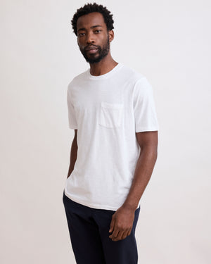 Men's short-sleeved T-shirt with chest pocket and round collar.