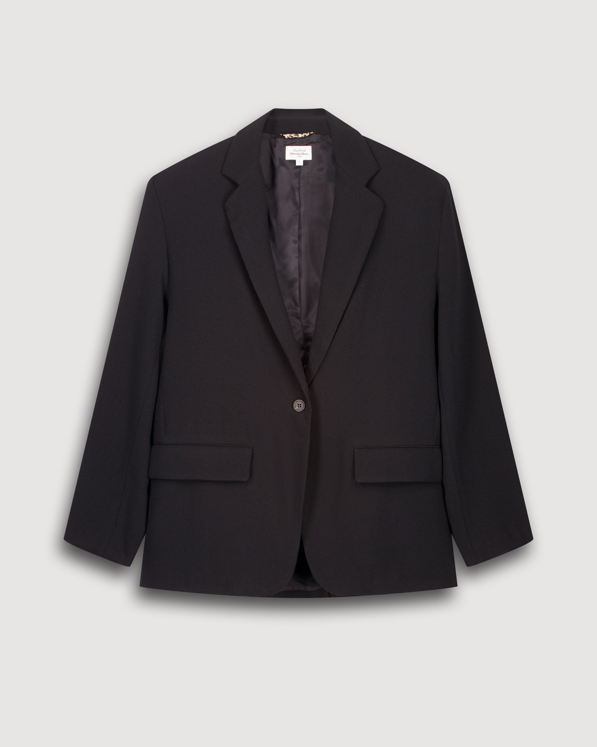 Loose-fitting women's blazer jacket with tailored collar in black crepe. Single button fastening. Two flap pockets and back vent. Black inner body lining and striped lined sleeves.