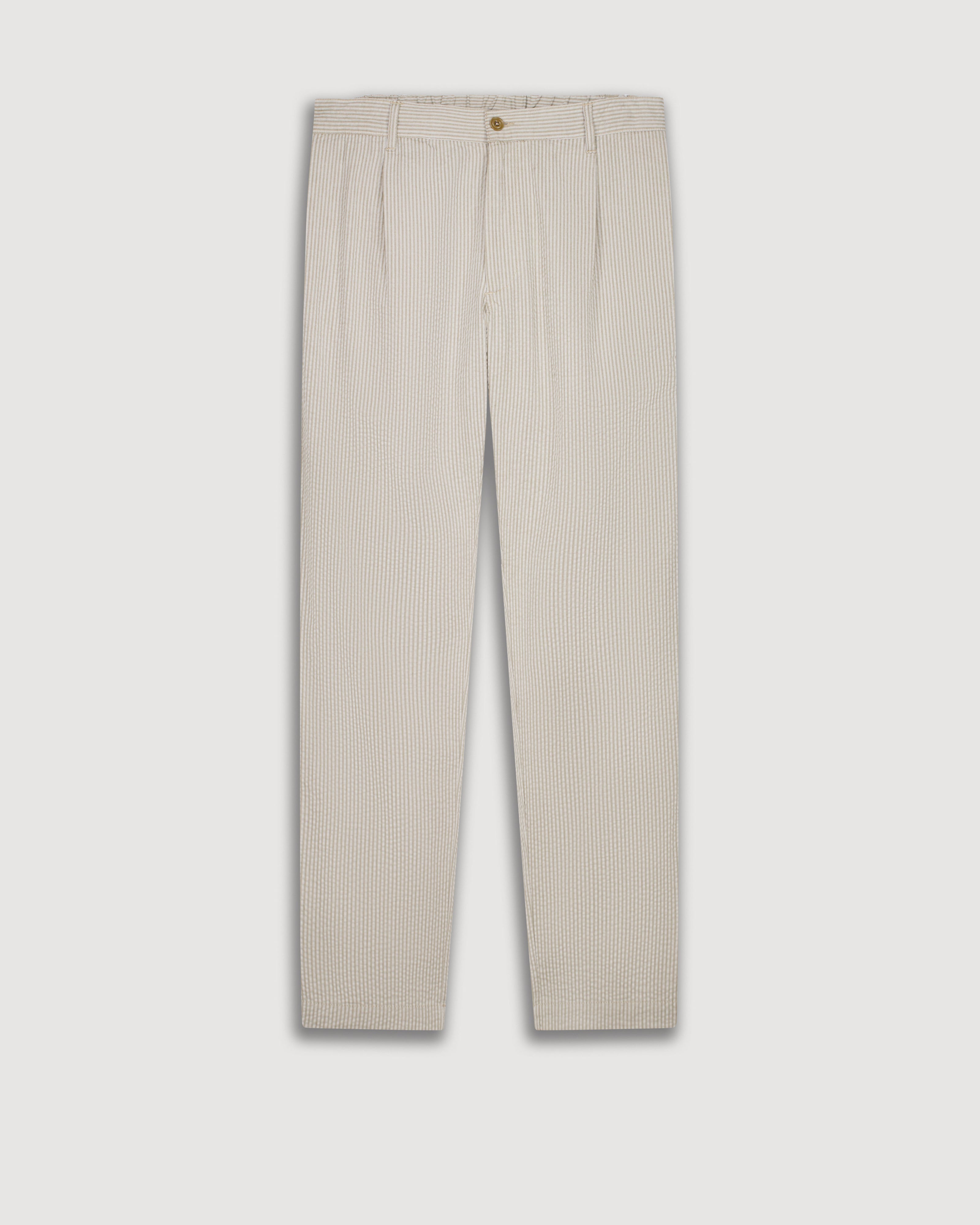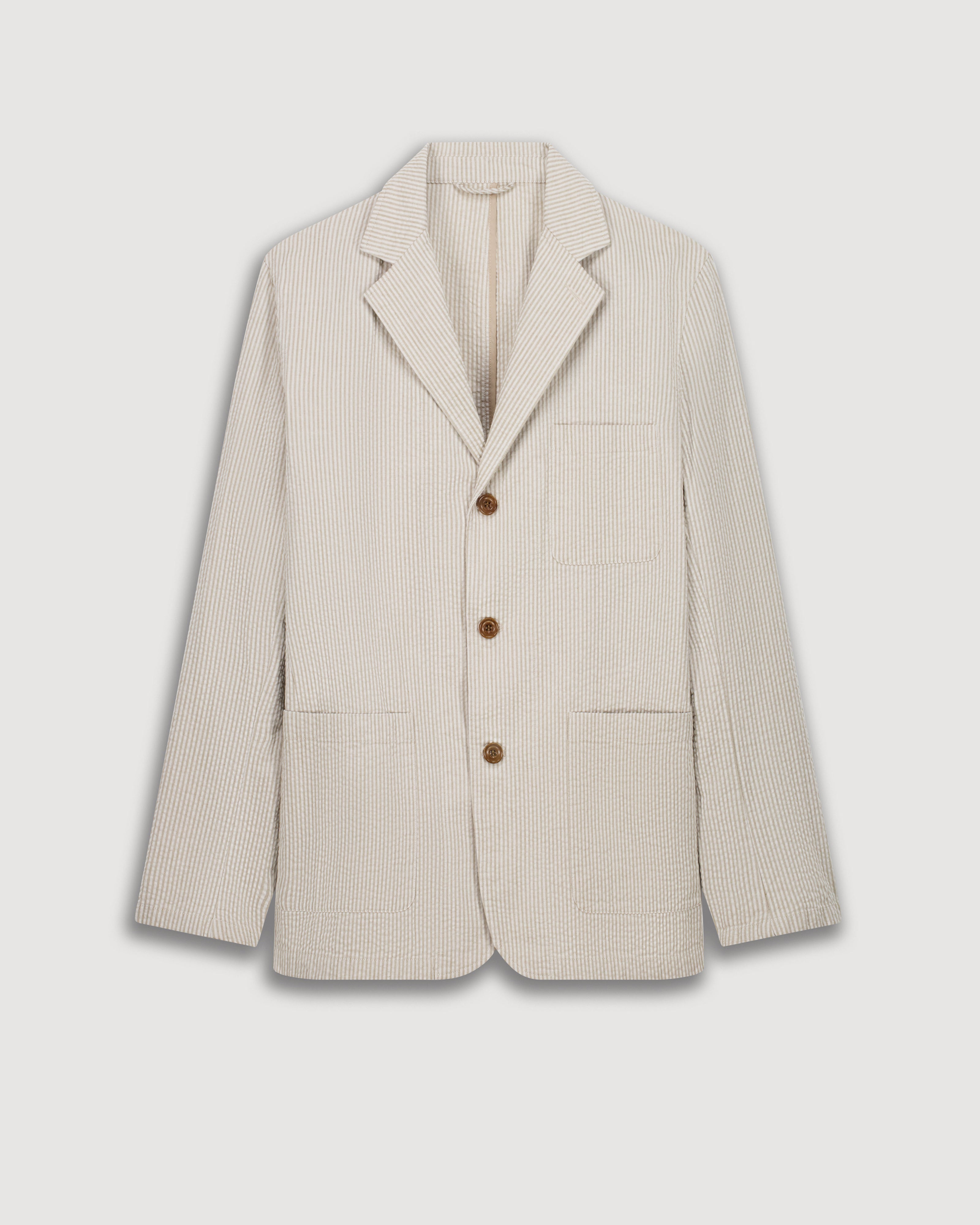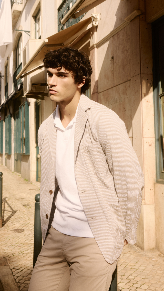 Una prenda imprescindible para la temporada de verano, el traje masculino en Seersucker seduce por su aspecto decididamente informal. Su tejido texturizado y gofrado le confiere a la vez estructura y fluidez, convirtiéndolo en una alternativa ideal para el guardarropa.Vestido para el hombre Hartford Diseñado para combinar ligereza y elegancia, el algodón fresco garantiza un ajuste impecable al tiempo que permite que la silueta respire. Apreciada en azul claro, beige o en Rayas - un efecto logrado gracias a un tejido magistral en el corazón de nuestros talleres- combina fácilmente con piezas sobrias. Para un enfoque clásico, los trajes de hombre combinan a la perfección con nuestra selección de camisas de hombre. Si buscas un estilo más informal, combínalo con una Camiseta o un polo. Llevado como total look con su Pantalones con una camisa a juego o una parte de abajo más informal, el traje en Seersucker se adapta a todos los estados de ánimo con elegancia natural.
