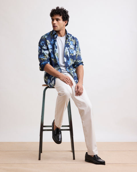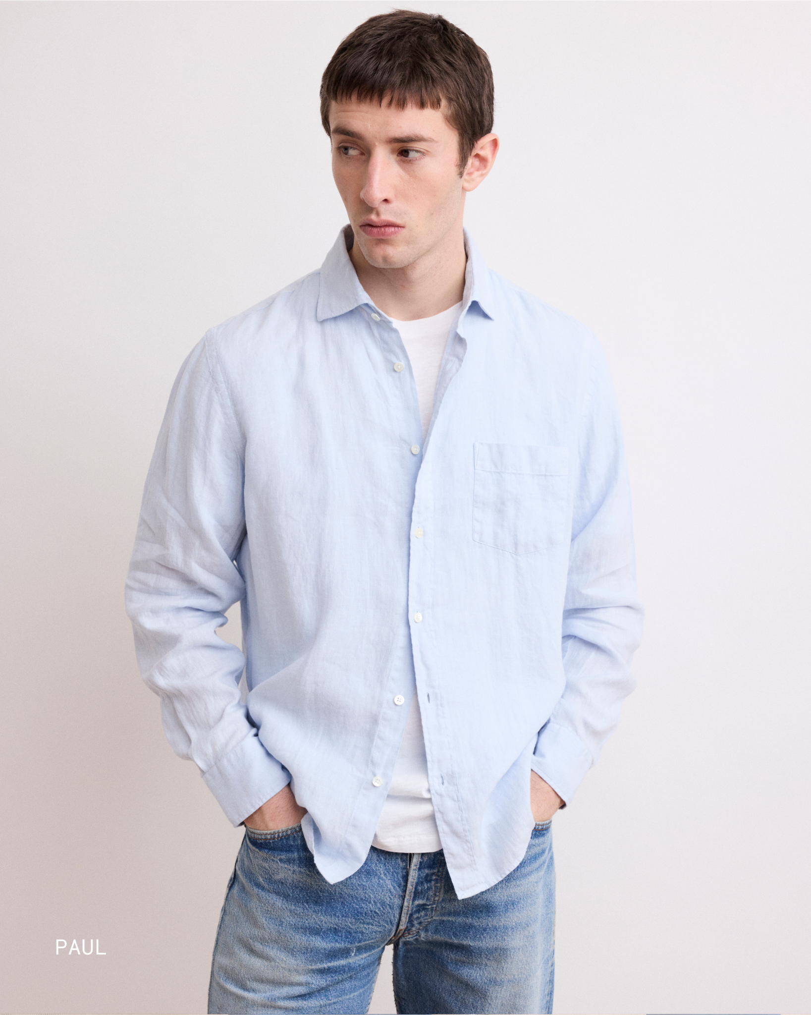 En primer lugar está la Camisa Paul, una Camisa casual que es uno de los primeros diseños de la marca. Es una pieza atemporal. En este Camisa es más relajada, gracias a su corte recto y su cuello suave. La Camisa Paul se moderniza con la elección de los materiales, el color adecuado o la raya correcta... eso es lo que la hace tan atemporal y clásica en Hartford.