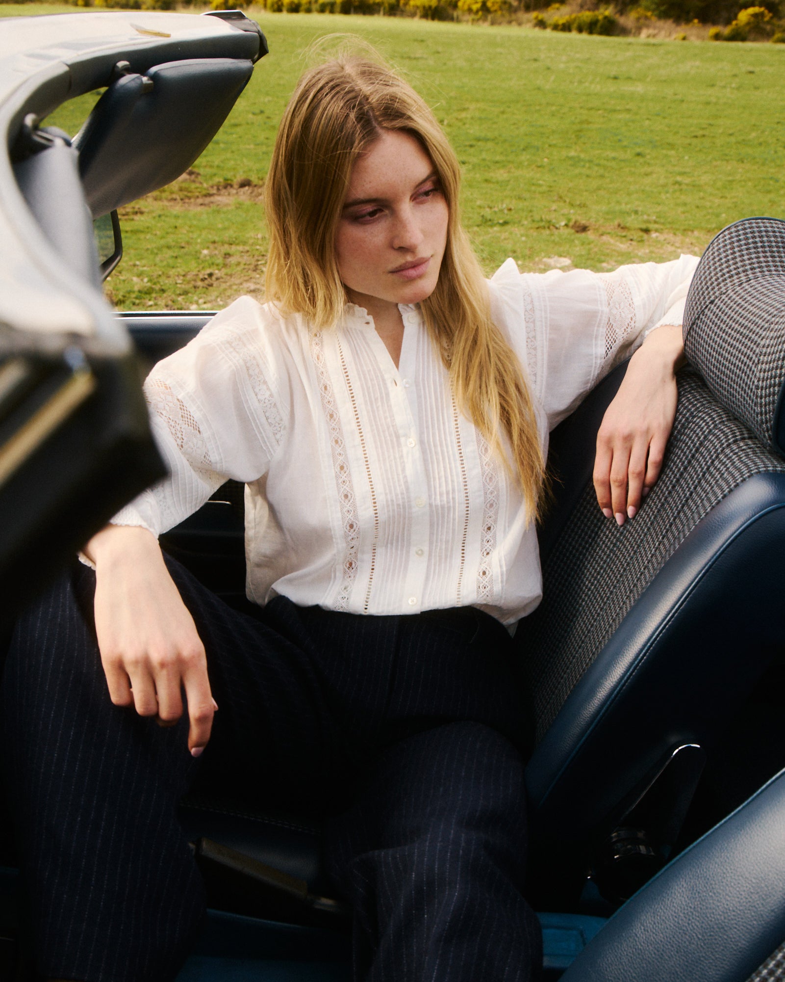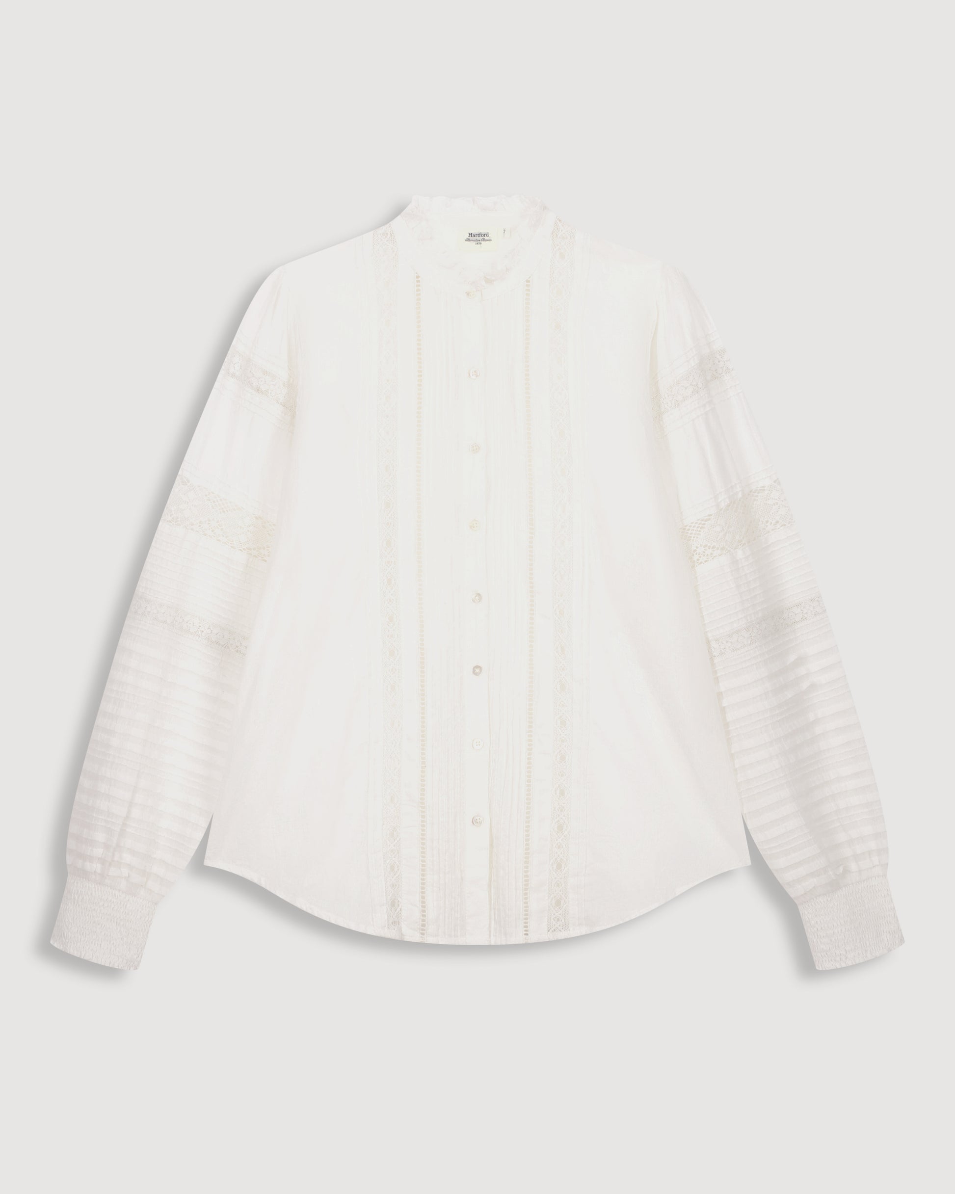 Camisa Cuello con volante para mujer. Escote redondo. Tapeta visible con botones de nácar. Detalles de encaje calado y pliegues. Fruncidos en hombros y espalda. Puños fruncidos. Bajo redondeado.