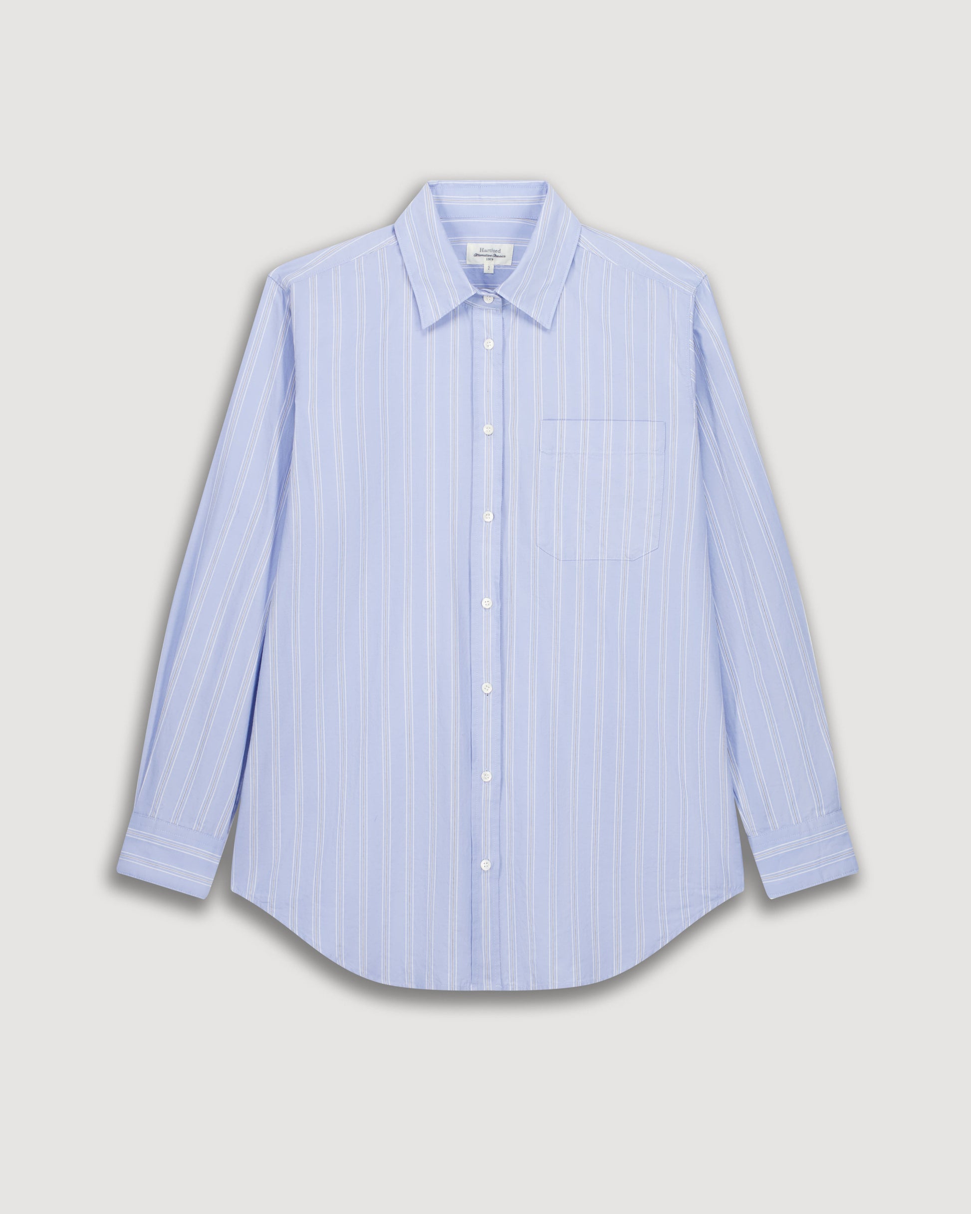 Camisa de mujer de corte holgado en Voile de algodón a rayas. Bolsillo en el pecho y mangas largas con puño sencillo. Tapeta visible con botones de nácar. Pliegues en la espalda.