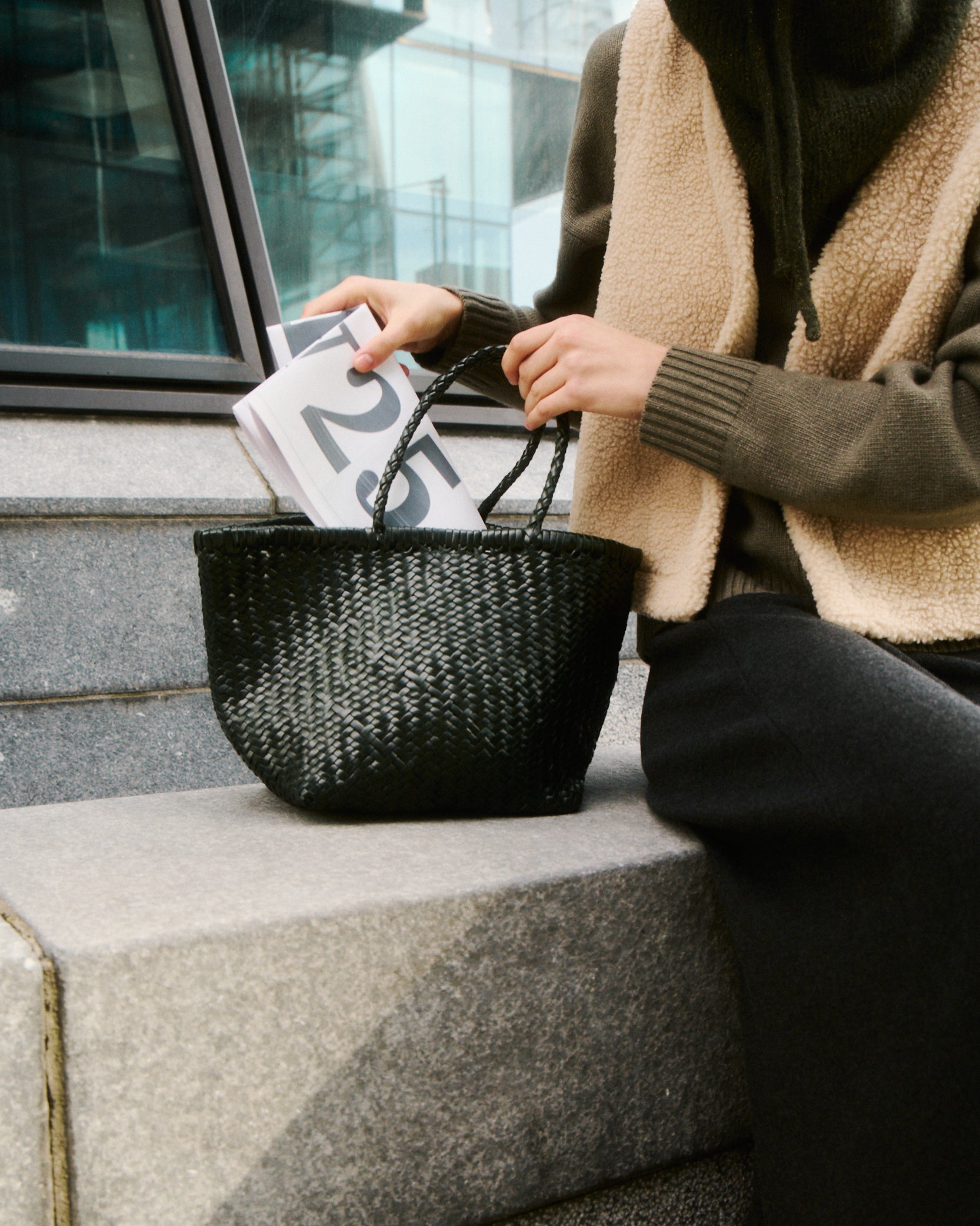 Bolso mujer mini-shopper en Cuero trenzado. Cierre con botón de presión. Asas dobles fijas.