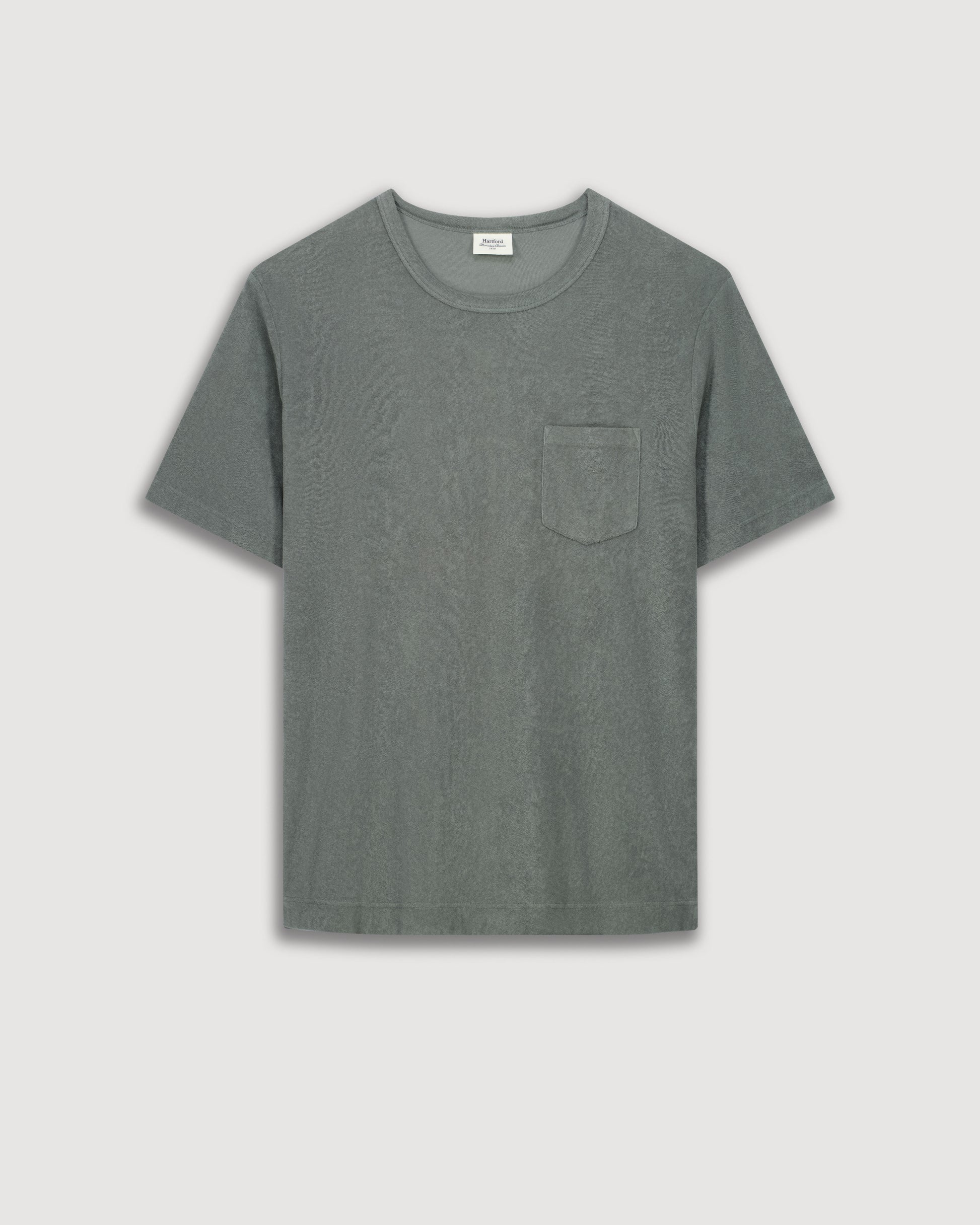 Camiseta de hombre de manga corta de felpa de algodón con bolsillo en el pecho y cuello redondo.