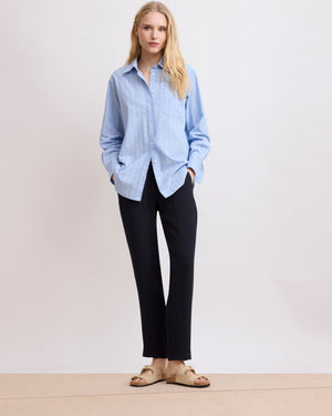 Pantalones pitillo de mujer de crepé con cintura elástica plisada de color beige. Talle bajo, dos bolsillos laterales y dos bolsillos ribeteados abotonados en la parte trasera. Largo 7/8.