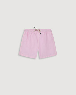 Maillot de bain enfant garçon à taille élastique avec cordon de serrage et poche à rabat dans le dos, coupe mi-longueur.