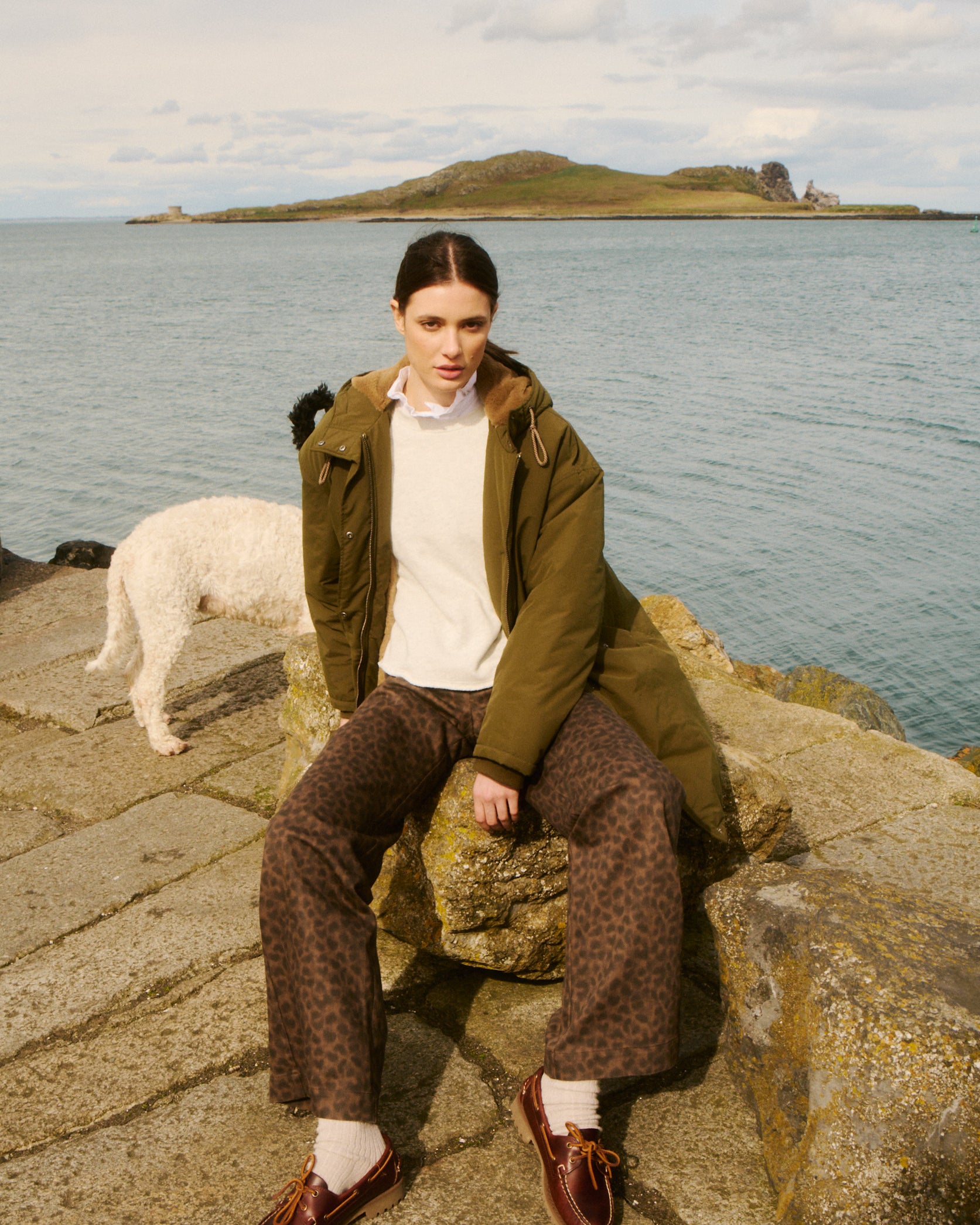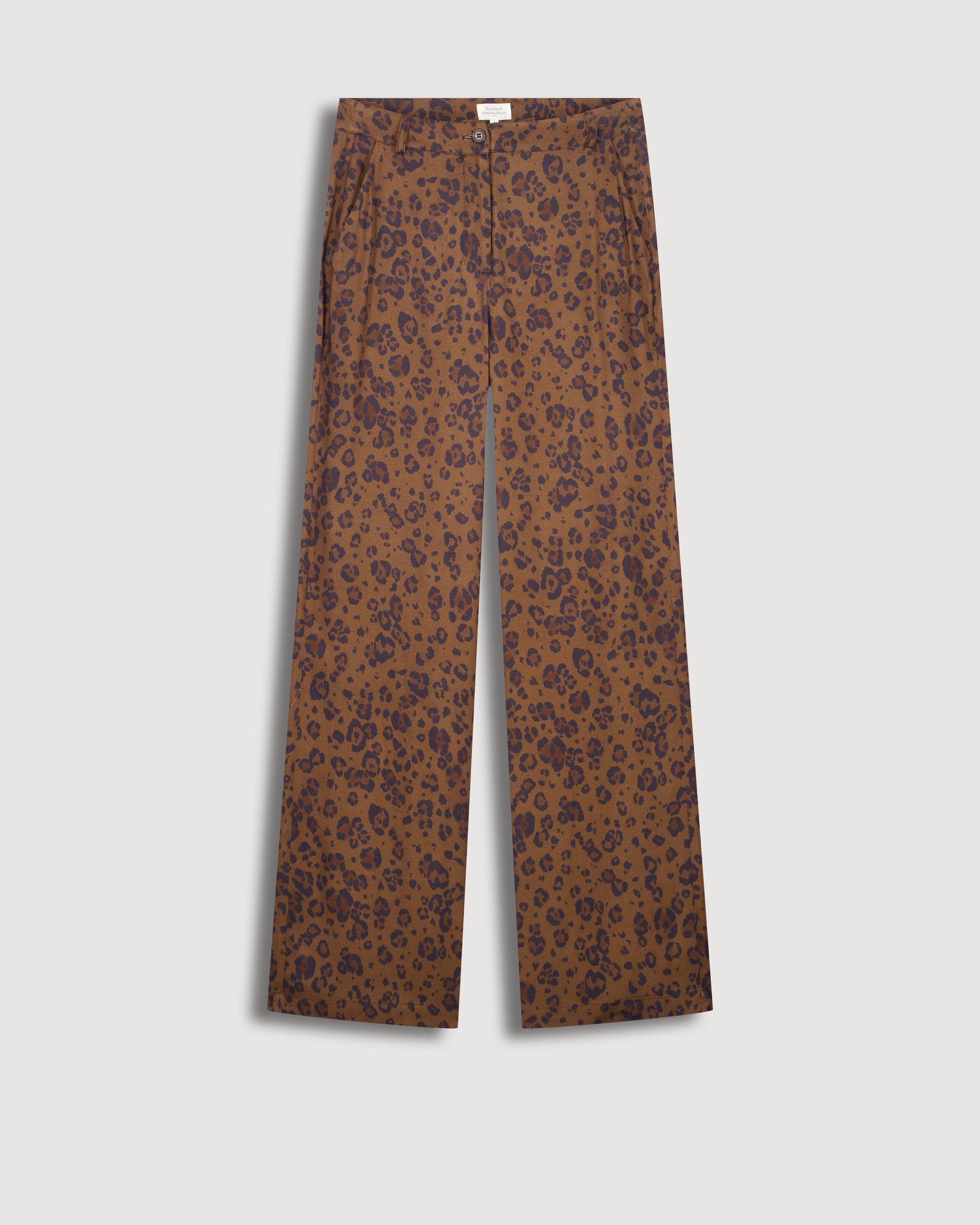 Pantalon femme large et fluide en satin de viscose imprimé léopard exclusif. Taille haute, ceinture plate avec passants et fermeture à glissière. Deux poches italiennes sur les côtés.