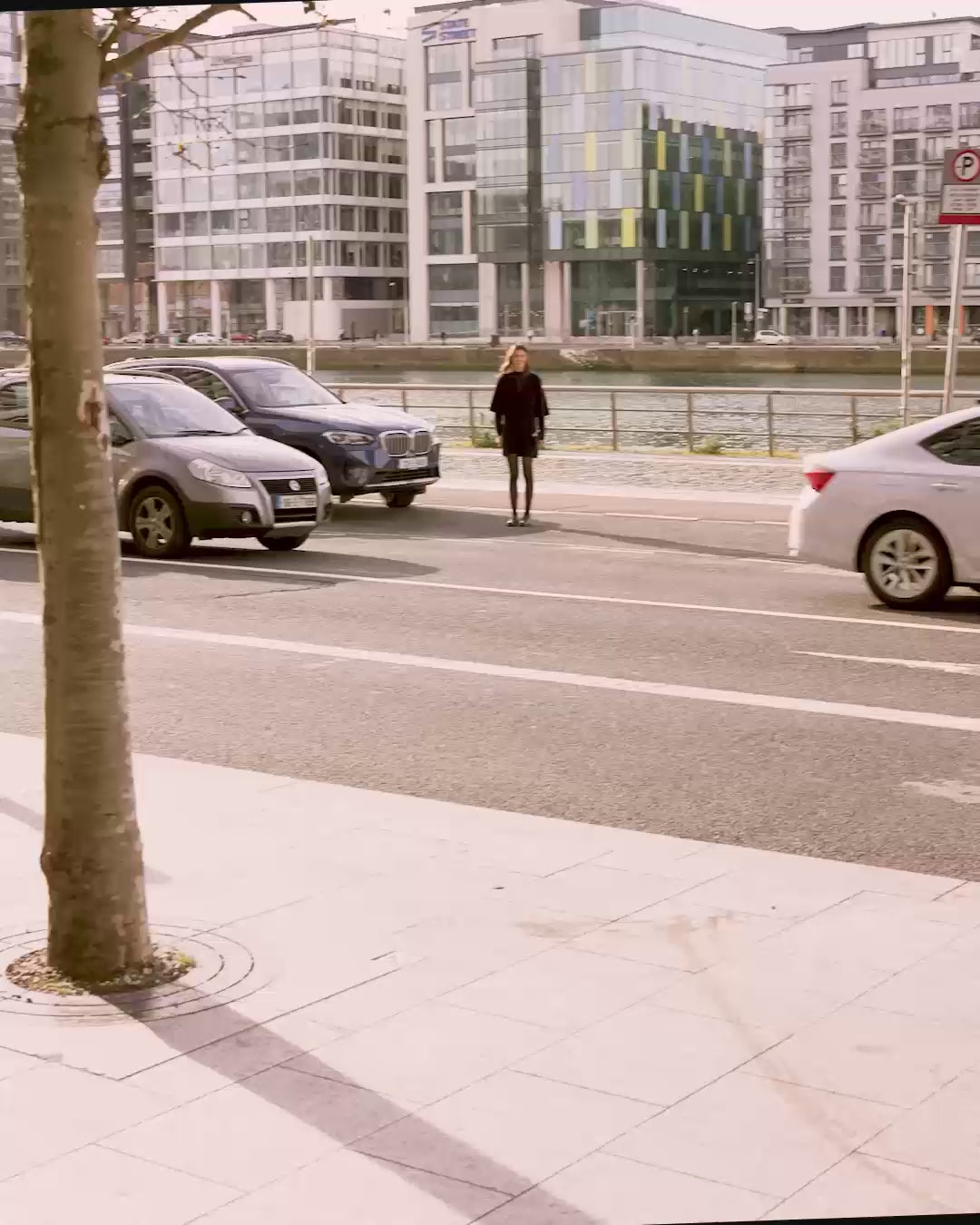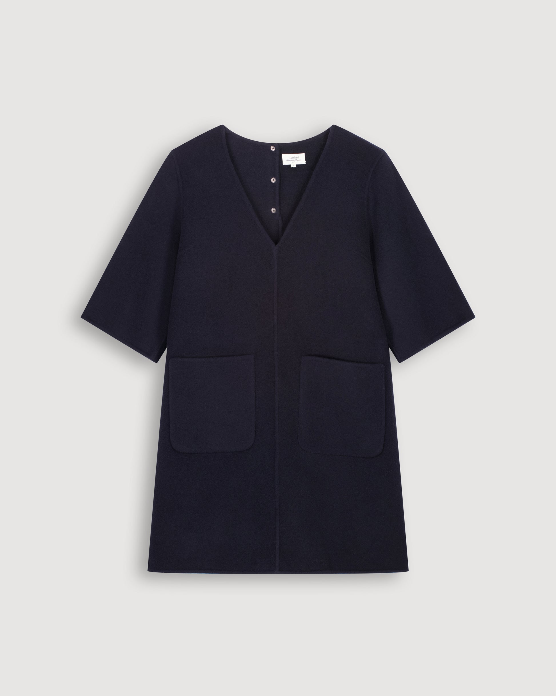 Robe femme en double face à col V, longueur genoux. Manches courtes, pinces poitrines et deux poches plaquées devant. Fermeture par trois boutons à pressions au dos. Détails de couture milieu devant et dos.