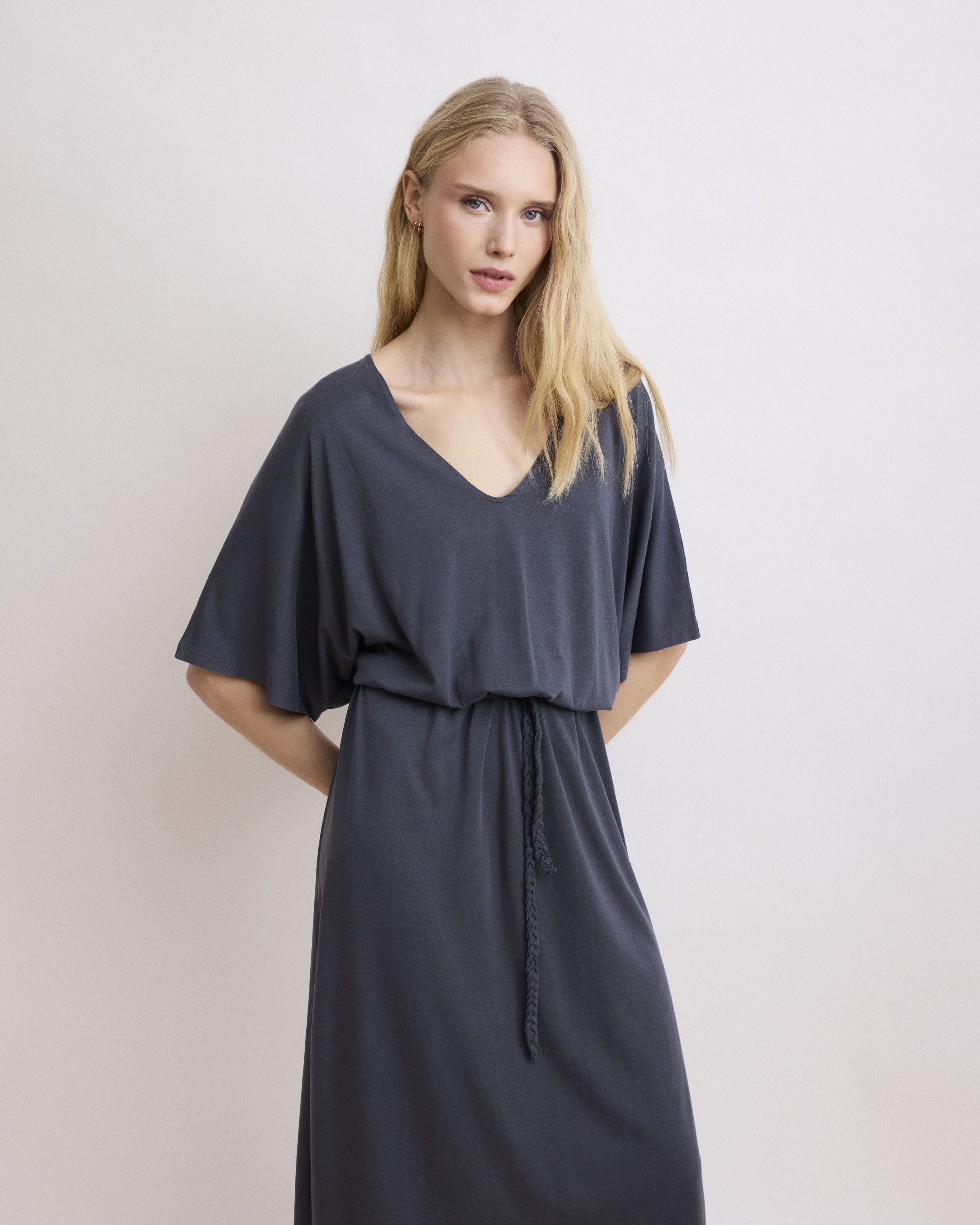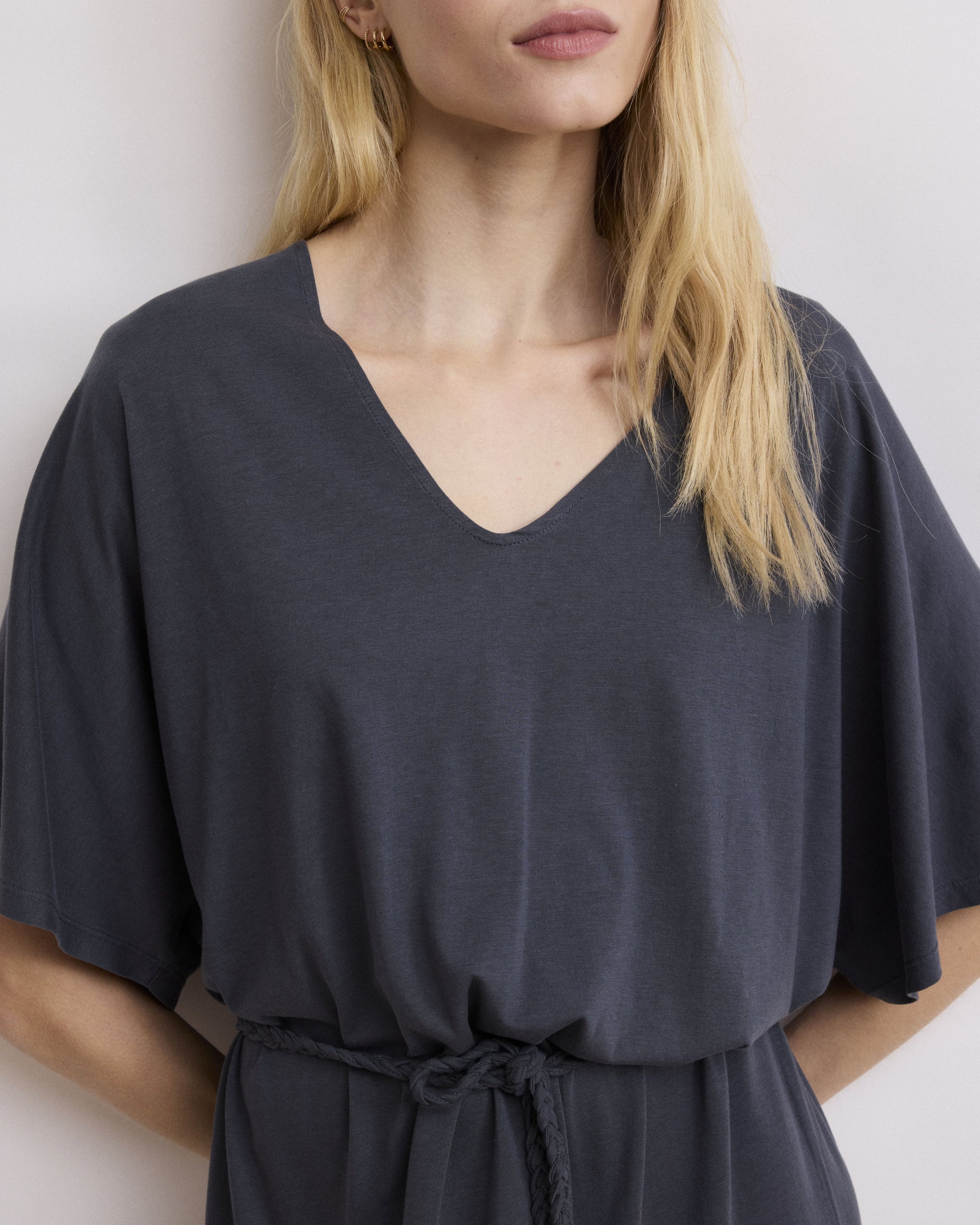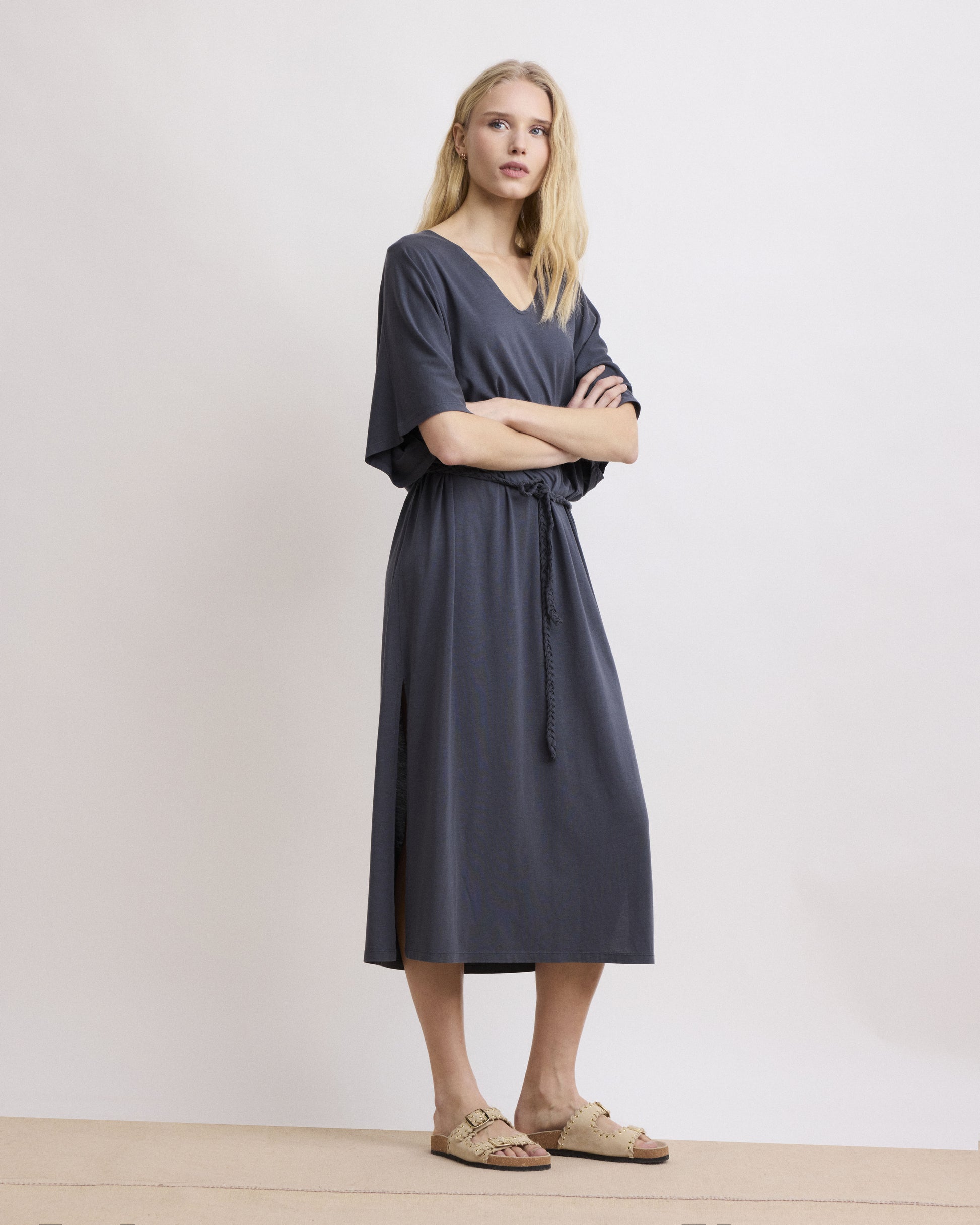 Robe t-shirt femme en lyocell et coton. Col V et longueur midi. Manches courtes avec emmanchures tombantes. Taille avec passants et ceinture tressée amovible. Fentes latérales.