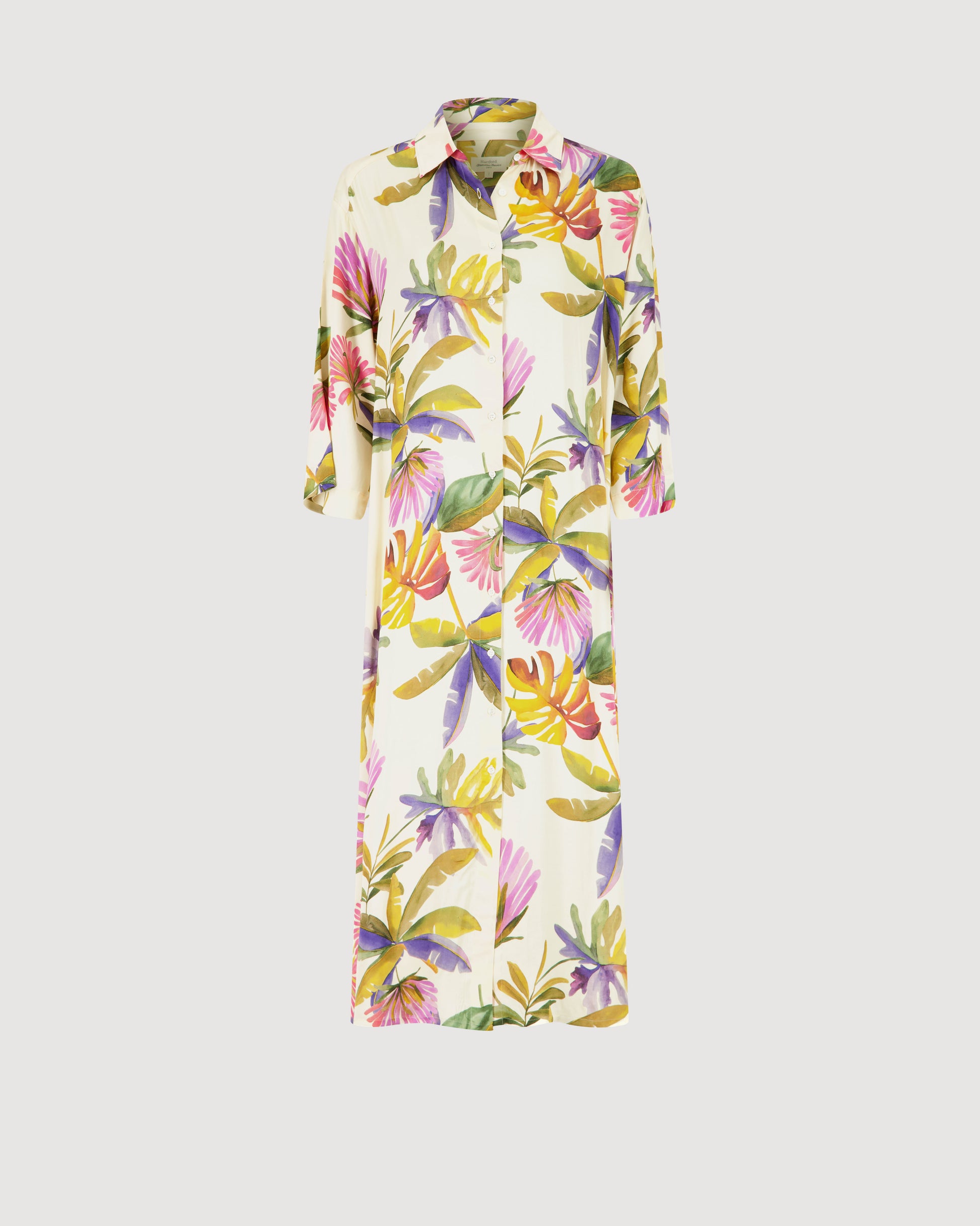 Robe chemise femme, ample, longueur midi en satin de viscose imprimé exclusif floral. Grandes manches avec emmanchures tombantes. Deux poches sur les côtés et deux fentes latérales.