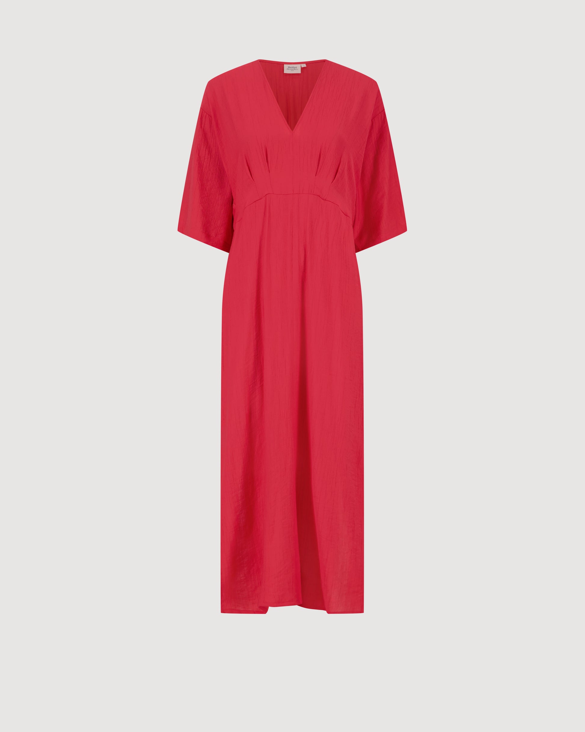 Robe femme longueur midi, col V en viscose froissée unie. Découpe sous la poitrine devant et taille élastiquée avec fronces au dos. Manches courtes amples avec emmanchures tombantes. Deux poches sur les côtés et deux fentes latérales.