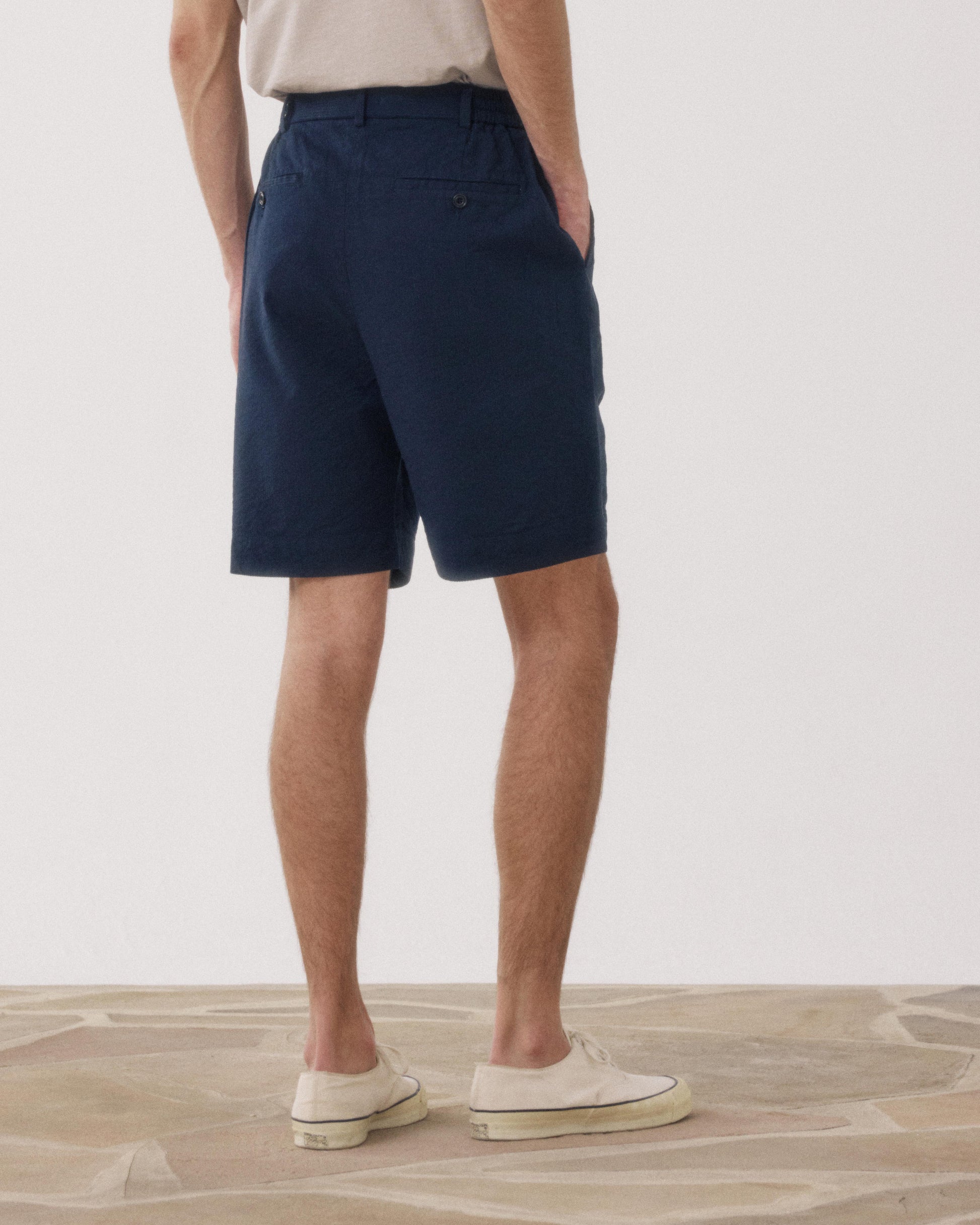 Short homme coupe droite à pli simple. Ceinture demi-élastiquée avec passants. Fermeture glissière à bouton.