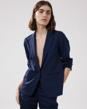 Veste blazer femme à col tailleur. Coupe ajustée, boutonnage simple avec un bouton. Deux poches passepoilées devant et fente d'aisance dans le dos.