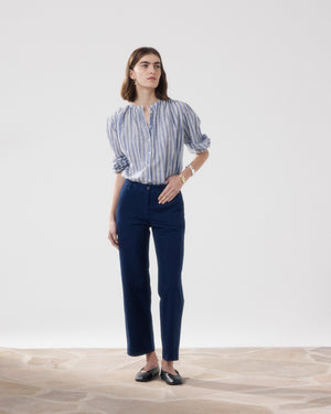 Recht gesneden damesbroek. Platte riem met lussen, ritssluiting en knoop in de taille. Italiaanse zakken aan de zijkant en paspelzakken met knoop aan de achterkant.