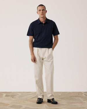 Recht gesneden herenbroek met plooien. Twee zijzakken en twee paspelzakken aan de achterkant. Ritssluiting met knoop. Platte riem met lussen.