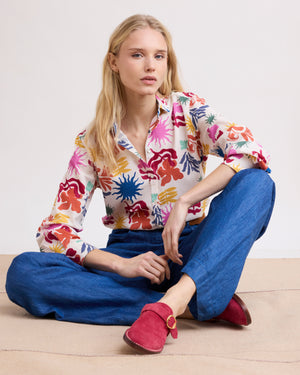 Chemise femme iconique en coton imprimé exclusif estival. Légèrement cintrée avec un petit col et une patte de boutonnage apparente. Boutons en nacre.