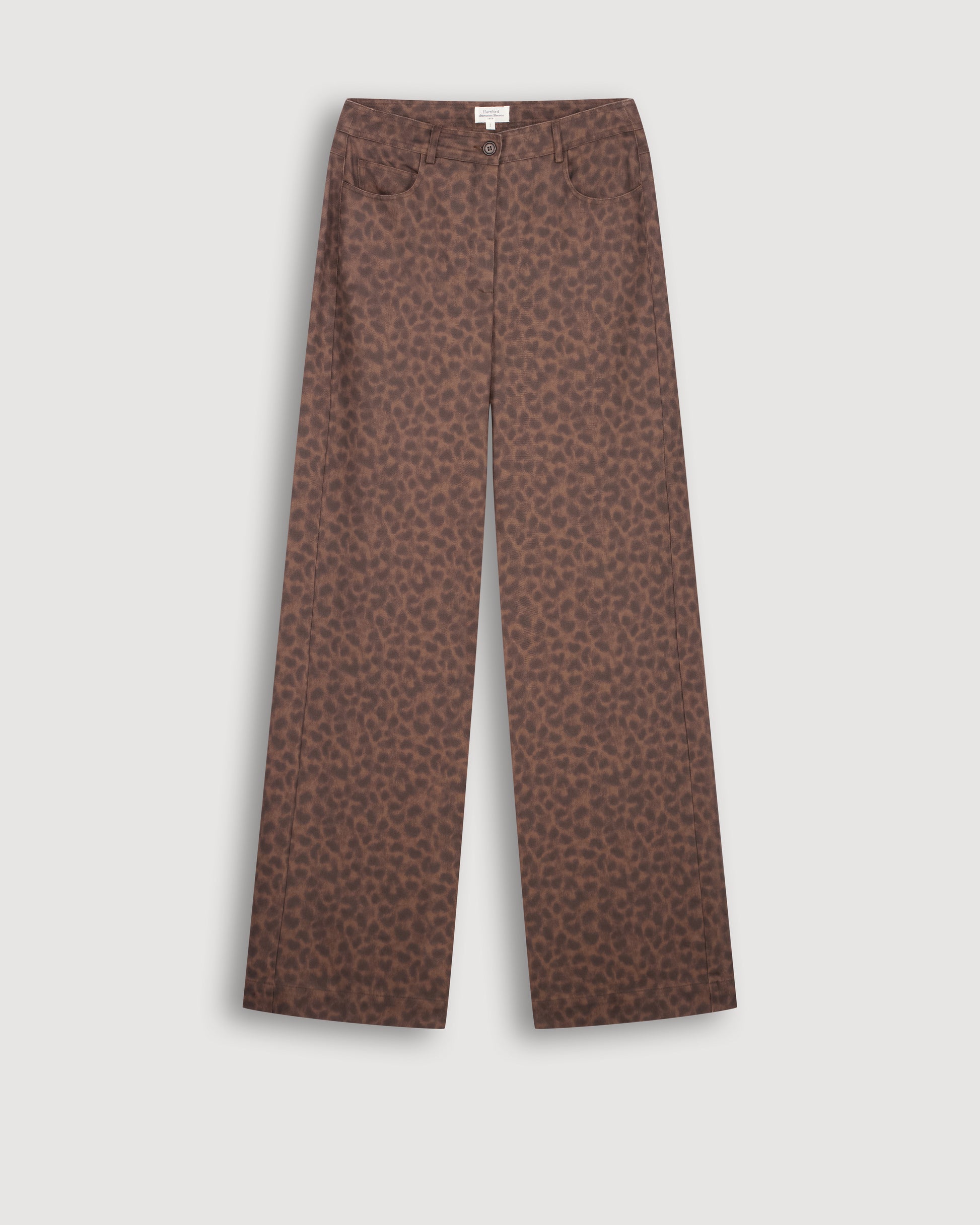Pantalon femme large en coton et lyocell imprimé léopard, coupe cinq poches. Ceinture plate avec passants. Fermeture à glissière et bouton à la taille.